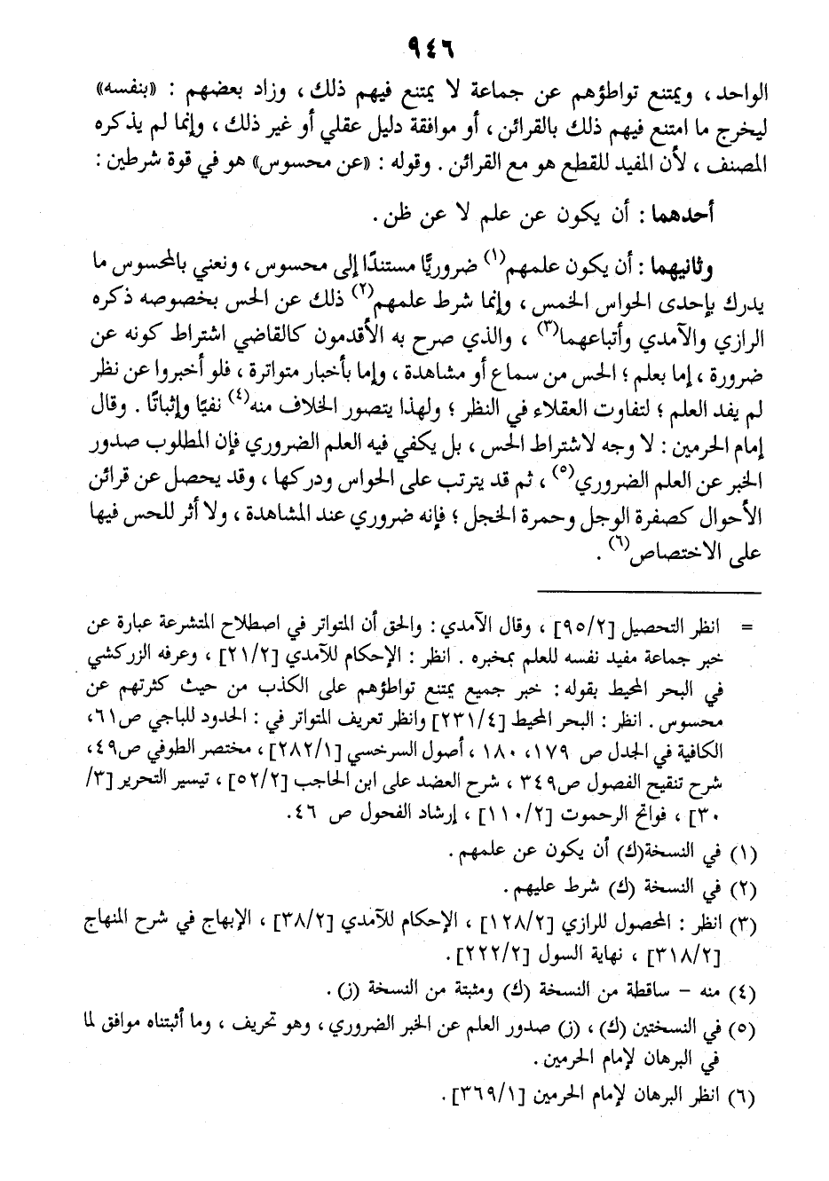 وثانيهما: أن يكون علمهم ضروريا مستندا إلى محسوس، ونعني بالمحسوس ما يدرك بإحدى الحواس الخمس، وإنما شرط علمهم ذلك عن الحس بخصوصه ذكره الرازي والآمدي وأتباعهما والذي صرح به الأقدمون كالقاضي اشتراط كونه عن ضرورة إما بعلم، الحس من سماع أو مشاهدة وإما بأخبار متواترة، فلو أخبروا عن نظر لم يفد العلم لتفاوت العقلاء في النظر، ولهذا يتصور الخلاف منه نفيا وإثباتا وقال إمام الحرمين: لا وجه لاشتراط الحس، بل يكفي فيه العلم الضروري فإن المطلوب صدور الخبر عن العلم الضروري، ثم قد يترتب على الحواس ودركها، وقد يحصل عن قرائن الأحوال كصفرة الوجل وحمرة الخجل، فإنه ضروري عند المشاهدة، ولا أثر للحس فيها على الاختصاص.