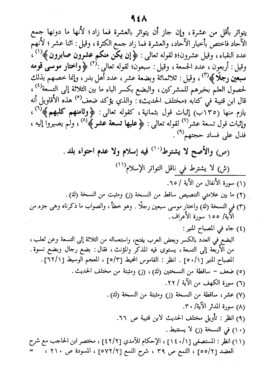 يتواتر بأقل من عشرة، وإن جاز أن يتواتر بالعشرة فما زاد، لأنها ما دونها جمع الآحاد فاختص بأخبار الآحاد، والعشرة فما زاد جمع الكثرة، وقيل: اثنا عشر، لأنهم عدد النقباء وقيل عشرون لقوله تعالى: {إن يكن منكم عشرون صابرون} وقيل: أربعون عدد الجمعة، وقيل: سبعون، لقوله تعالى: {واختار موسى قومه سبعين رجلا} وقيل: ثلاثمائة وبعضة عشر، عدد أهل بدر وإنما خصهم بذلك لحصول العلم بخبرهم للمشركين، والبضع بكسر الباء ما بين الثلاثة إلى التسعة قال ابن قتيبة في كتابه (مختلف الحديث): والذي يؤكد ضعف هذه الأقاويل أنه يلزم منها (١٣٥ب) إثبات قول بثمانية، كقوله تعالى: {وثامنهم كلبهم} وإثبات قول تسعة عشر لقوله تعالى: {عليها تسعة عشر} ولم يصيروا إليه فدل على فساد حجتهم.