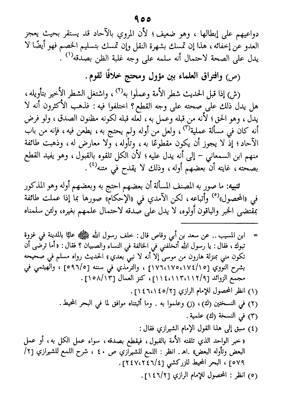 (ش) إذا قبل الحديث شطر الأمة وعملوا به واشتغل الشطر الأخير بتأويله هل يدل ذلك على صحته على وجه القطع؟ اختلفوا فيه: فذهب الأكثرون أنه لا يدل وهو الحق لأنه من قبله وعمل به لعله قبله لكونه مظنون الصدق، ولو فرض أنه كان في مسألة عملية ولعل من أوله ولم يحتج به، يطعن فيه أنه من باب الآحاد، إذ لا يجوز أن يكون مقطوعا به، وتأوله ولا معارض له، وذهبت طائفة منهم ابن السمعاني - إلى أنه يدل عليه، لأن الكل تلقوه بالقبول وهو يفيد القطع بصحته، غايته أن بعضهم أوله وذلك لا يقدح في متنه.