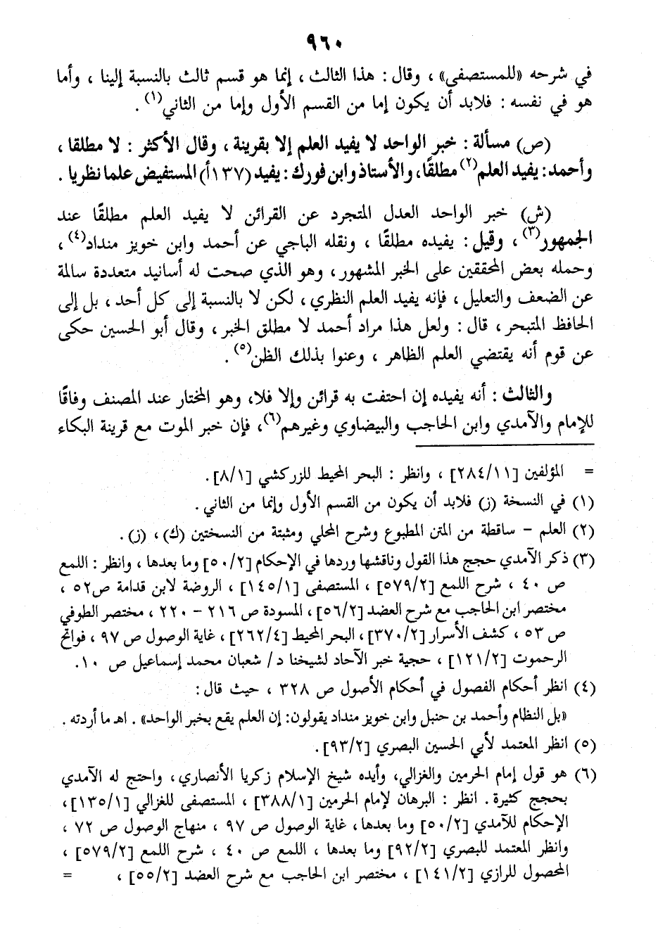 (ش) خبر الواحد العدل المتجرد عن القرائن لا يفيد العلم مطلقا عند الجمهور: وقيل: يفيده مطلقا، ونقله الباجي عن أحمد وابن خويز منداد وحمله بعض المحققين على الخبر المشهور، وهو الذي صحت له أسانيد متعدد سالمة عن الضعف والتعليل فإنه يفيد العلم النظري، لكن لا بالنسبة إلى كل أحد، بل إلى الحافظ المتبحر، قال: ولعل هذا مراد أحمد لا مطلق الخبر، وقال أبو الحسين حكى= عن قوم أنه يقتضي العلم الظاهر، وعنوا بذلك الظن