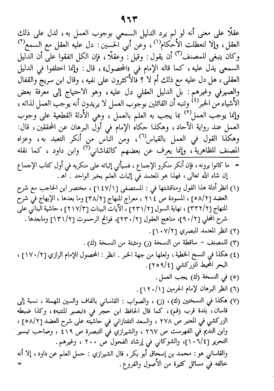عقلا على معنى أنه لو لم يرد الدليل السمعي بوجوب العمل به لدل على ذلك العقل، وإلا لتعطلت الأحكام وعن أبي الحسين: دل عليه العقل مع السمع وكان ينبغي للمصنف، أن يقول: وقيل: عقلا، فإن الكل اتفقوا على أن الدليل السمعي يدل عليه، كما قاله الإمام في (المحصول) قال: وإنما اختلفوا في الدليل العقلي، هل دل عليه مع ذلك أم لا؟ فالأكثرون على نفيه، وقال ابن سريج والقفال والصيرفي وغيرهم: بل الدليل العقلي دل عليه، وهو الاحتياج إلى معرفة بعض الأشياء من الخبر، وتنبه أن القائلين بوجوب العمل لا يريدون أنه يوجب العمل لذاته وإنما يوجب العمل بما يجب به العلم بالعمل، وهي الأدلة القطعية على وجوب العمل عند رواية الآحاد، وهكذا حكاه الإمام في أول (البرهان) عن المحققين، قال: وهكذا القول في العمل بالقياس ومن الناس من أنكر التعبد به، وعزاه المصنف للظاهرية وإنما يعرف عن بعضهم كالقاشاني وابن داود، كما نقله