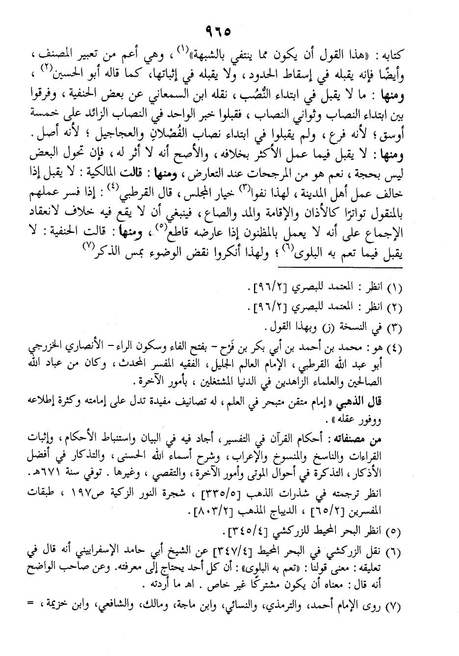 كتابه: (هذا القول أن يكون مما ينتفي بالشبهة) وهي أعم من تعبير المصنف وأيضا فإنه يقبله في إسقاط الحدود، ولا يقبله في إثباتها، كما قاله أبو الحسين ومنها: ما لا يقبل في ابتداء النصب، نقله ابن السمعاني عن بعض الحنفية، وفرقوا بين ابتداء النصاب وثواني النصاب، فقبلوا خبر الواحد في النصاب الزائد على خمسة أوسق، لأنه فرع ولم يقبلوا في ابتداء نصاب الفصلان والعجاجيل، لأنه أصل. ومنها: لا يقبل فيما عمل الأكثر بخلافه، والأصح أنه لا أثر له، فإن تحول البعض ليس بحجة، نعم هو من المرجحات عند التعارض، ومنها: قالت المالكية: لا يقبل إذا خالف عمل أهل المدينة، لهذا نفوا خيار المجلس، قال القرطبي: إذا فسر عملهم بالمنقول تواترا كالأذان والإقامة والمد والصاع، فينبغي أن لا يقع فيه خلاف لانعقاد الإجماع على أنه لا يعمل بالمظنون إذا عارضه قاطع ومنها: قالت الحنفية: لا يقبل فيما تعم به البلوى ولهذا أنكروا نقض الوضوء بمس الذكر.