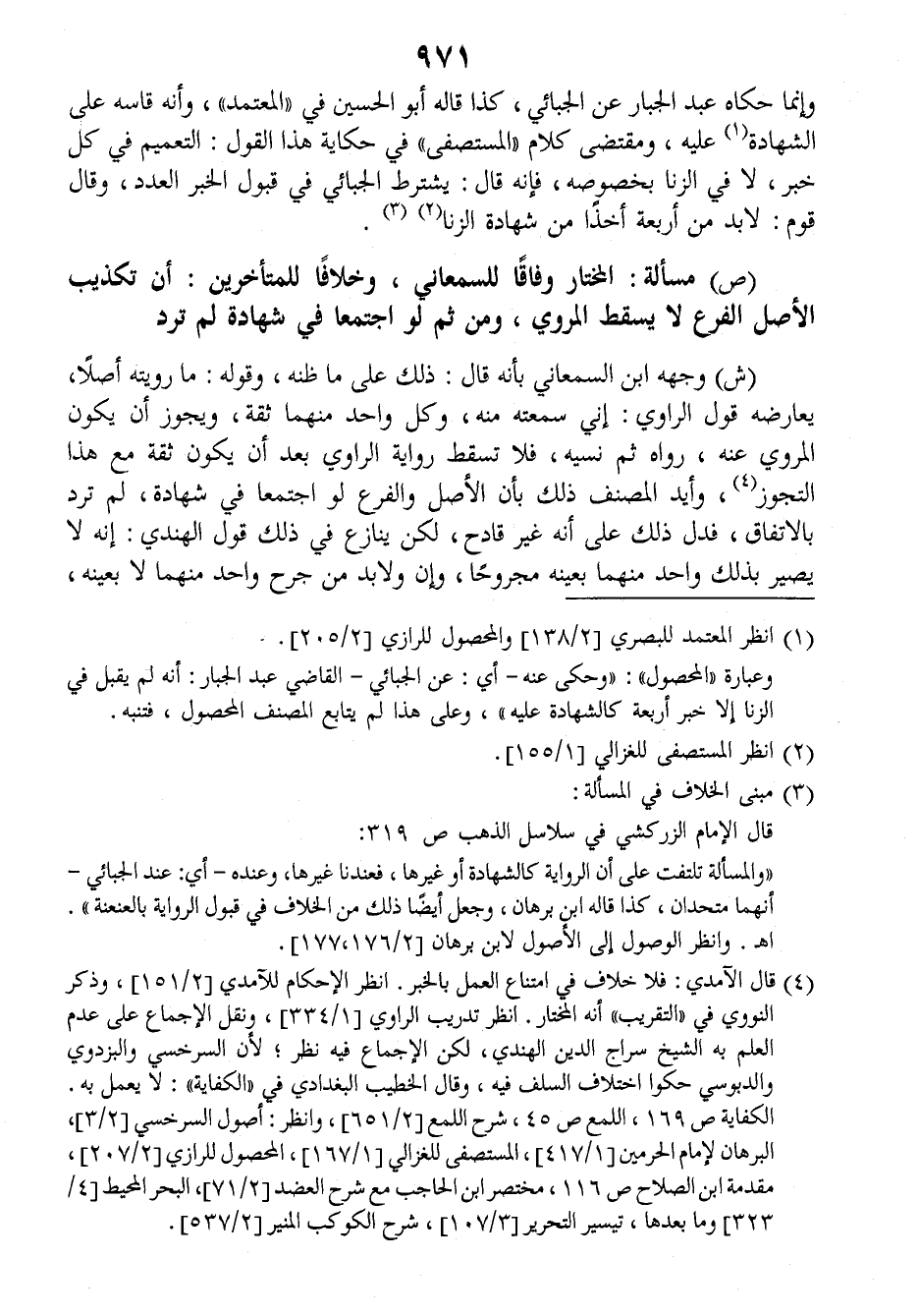 وإنما حكاه عبد الجبار عن الجبائي، كذا قاله أبو الحسين في (المعتمد) وأنه قاسه على الشهادة عليه، ومقتضى كلام (المستصفى) في حكاية هذا القول: التعميم في كل خبر، لا في الزنا بخصوصه، فإنه قال: يشترط الجبائي في قبول الخبر العدد، وقال قوم: لا بد من أربعة أخذا من شهادة الزنا.