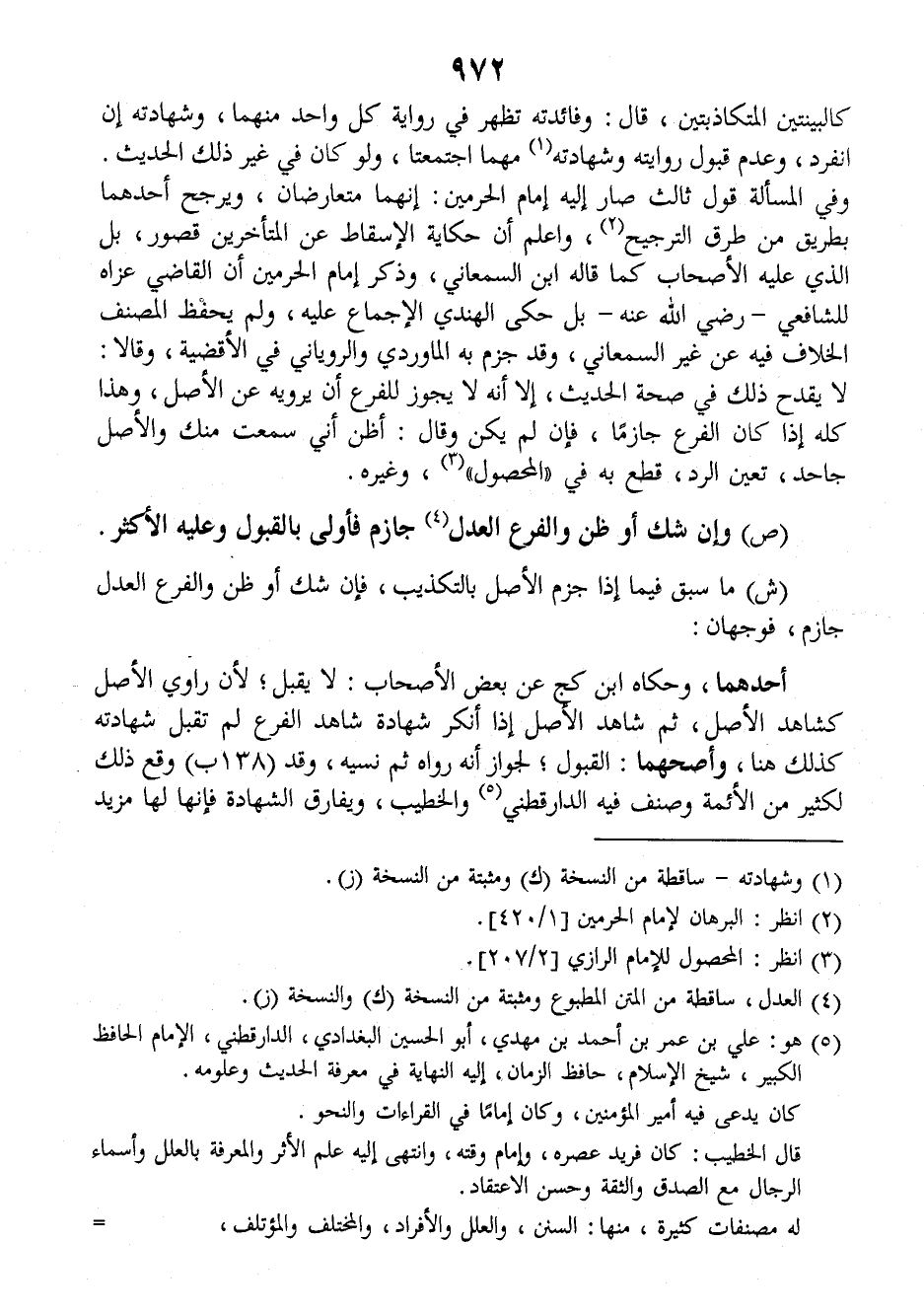 كالبينتين المتكاذبتين، قال: وفائدته تظهر في رواية كل واحد منهما، وشهادته إن انفرد وعدم قبول روايته وشهادته مهما اجتمعتا ولو كان في غير ذلك الحديث. وفي المسألة قول ثالث صار إليه إمام الحرمين: إنهما متعارضان ويرجح أحدهما بطريق من طرق الترجيح، واعلم أن حكاية الإسقاط عن المتأخرين قصور، بل الذي عليه الأصحاب كما قاله ابن السمعاني، وذكر إمام الحرمين أن القاضي عزاه للشافعي رضي الله عنه، بل حكى الهندي الإجماع عليه، ولم يحفظ المصنف الخلاف فيه عن غير السمعاني وقد جزم به الماوردي والروياني في الأقضية، وقالا: لا يقدح ذلك في صحة الحديث، إلا أنه لا يجوز للفرع أن يرويه عن الأصل وهذا كله إذا كان الفرع جازما فإن لم يكن وقال: أظن أني سمعت منك والأصل جاحد، تعين الرد، قطع به في (المحصول) وغيره.