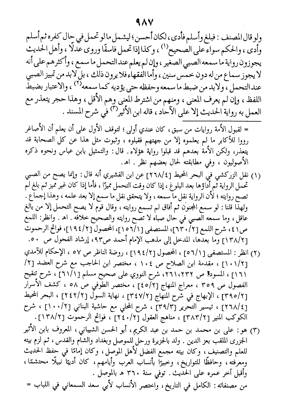 ولو قال المصنف: فبلغ وأسلم فأدى، لكان أحسن، ليشمل ما لو تحمل في حال كفره ثم أسلم وأدى، والحكم سواء على الصحيح، وكذا إذا تحمل فاسقا وروى عدلا، وأهل الحديث يجوزون رواية ما سمعه الصبي الصغير، وإن لم يعلم عند التحمل ما سمع، وأكثرهم على أنه لا يجوز سماع من له دون خمس سنين، وأما الفقهاء فلا يرون ذلك، بل لا بد من تمييز الصبي عند التحمل. ولا بد من ضبط ما سمعه وحفظه حتى يؤديه كما سمعه والاعتبار بضبط اللفظ، وإن لم يعرف المعنى، ومنهم من اشترط المعنى وهم الأقل وهذا حجر يتعذر مع العمل به رواية الحديث إلا على الآحاد قاله ابن الأثير في شرح المسند.