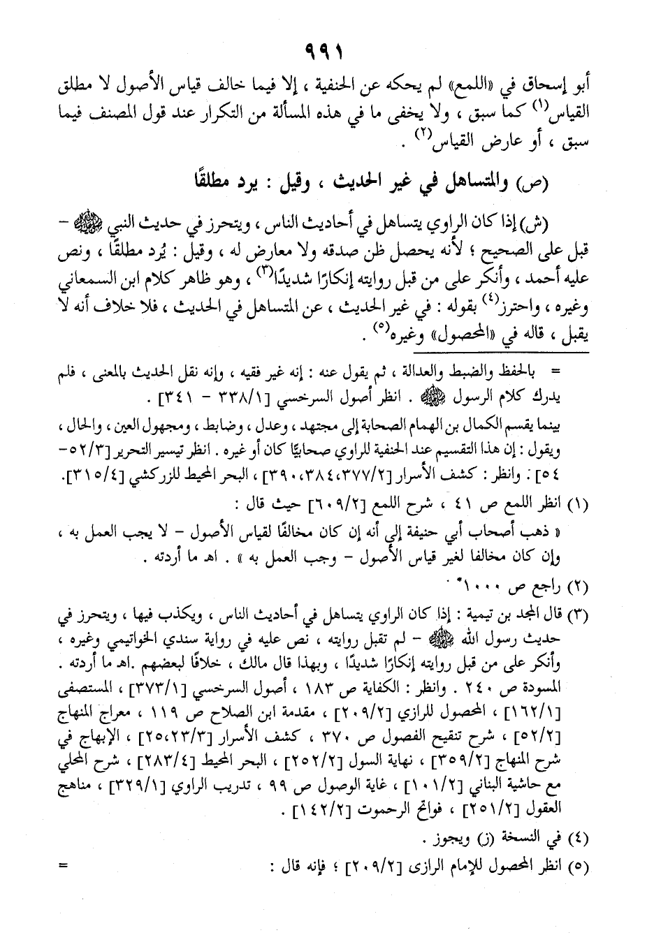 (ش) إذا كان الراوي يتساهل في أحاديث الناس، ويتحرز في حديث النبي صلى الله عليه وسلم قبل على الصحيح لأنه يحصل ظن صدقه ولا معارض له، وقيل: يرد مطلقا، ونص عليه أحمد، وأنكر على من قبل روايته إنكارا شديدا، وهو ظاهر كلام ابن السمعاني وغيره، واحترز بقوله: في غير الحديث، عن المتساهل في الحديث، فلا خلاف أنه لا يقبل، قاله في (المحصول) وغيره.