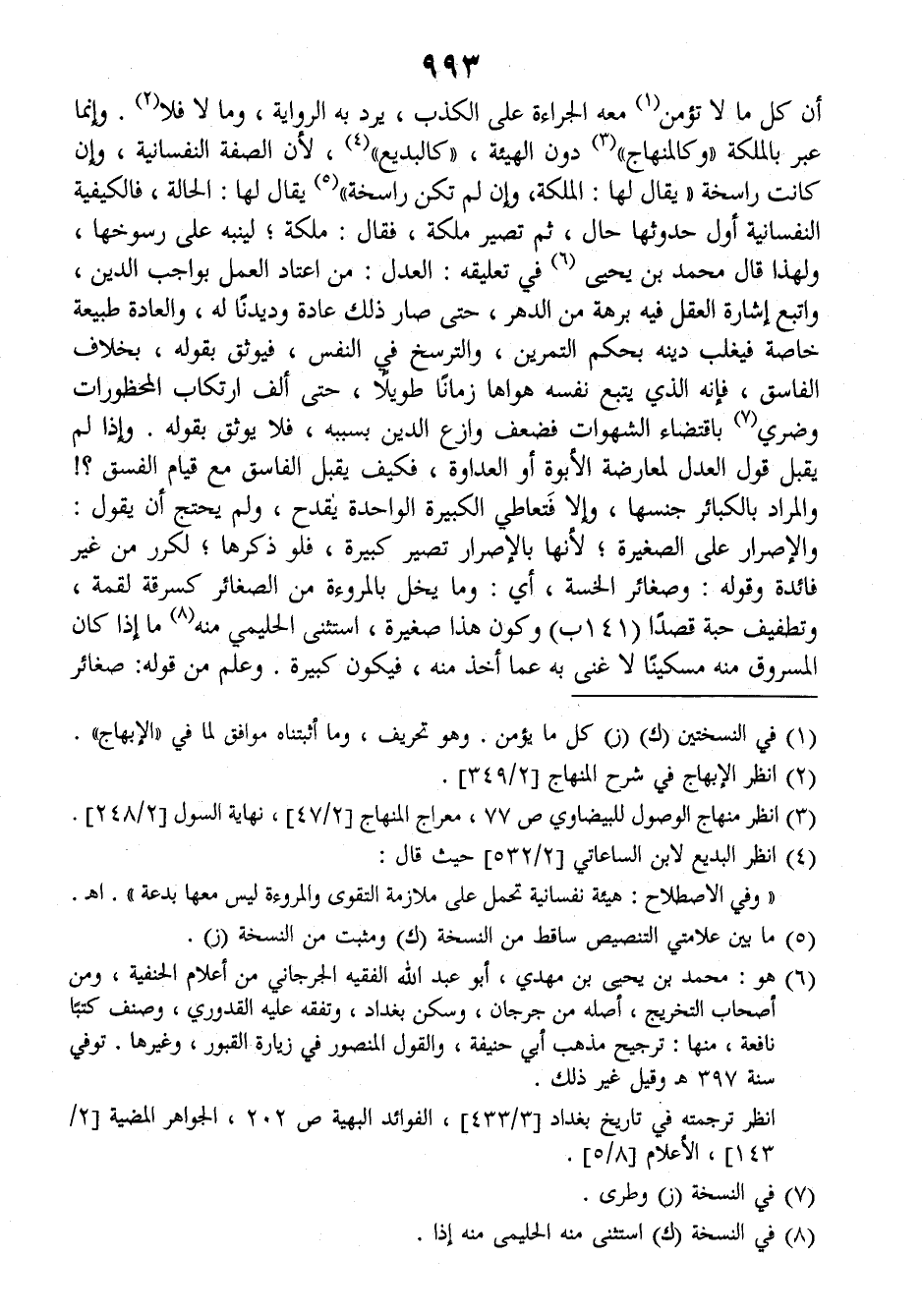 أن كل ما لا تؤمن معه الجراءة على الكذب، يرد به الراوية، وما لا فلا وإنما عبر بالملكة (وكالمنهاج) دون الهيئة، (كالبديع) لأن الصفة النفسانية، وإن كانت راسخة (يقال لها: الملكة، وإن لم تكن راسخة) يقال لها: الحالة، فالكيفية النفسانية أول حدوثها حال، ثم تصير ملكة، فقال: ملكة، لينبه على رسوخها ولهذا قال محمد بن يحيى في تعليقه: العدل: من اعتاد العمل بواجب الدين واتبع إشارة العقل فيه برهة من الدهر، حتى صار ذلك عادة وديدناً له والعادة طبيعة خاصة فيغلب دينه بحكم التمرين، والترسخ في النفس، فيوثق بقوله، بخلاف الفاسق فإنه الذي يتبع نفسه هواها زمانا طويلا، حتى ألف ارتكاب المحظورات وضري باقتضاء الشهوات فضعف وازع الدين بسببه، فلا يوثق بقوله.