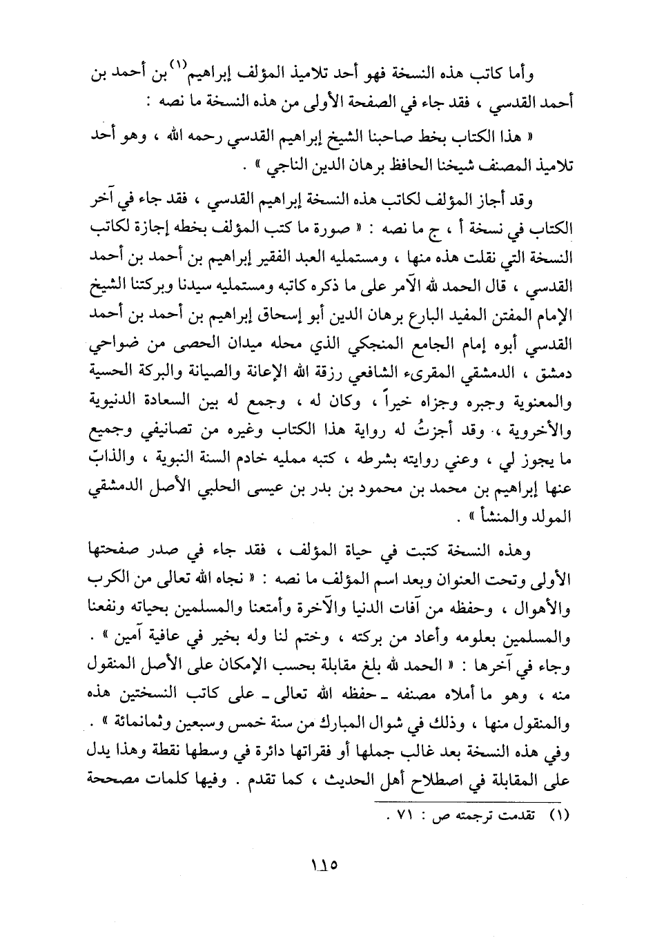 "هذا الكتاب بخط صاحبنا الشيخ إبراهيم القدسي رحمه الله، وهو أحد تلاميذ المصنف شيخنا الحافظ برهان الدين الناجي".