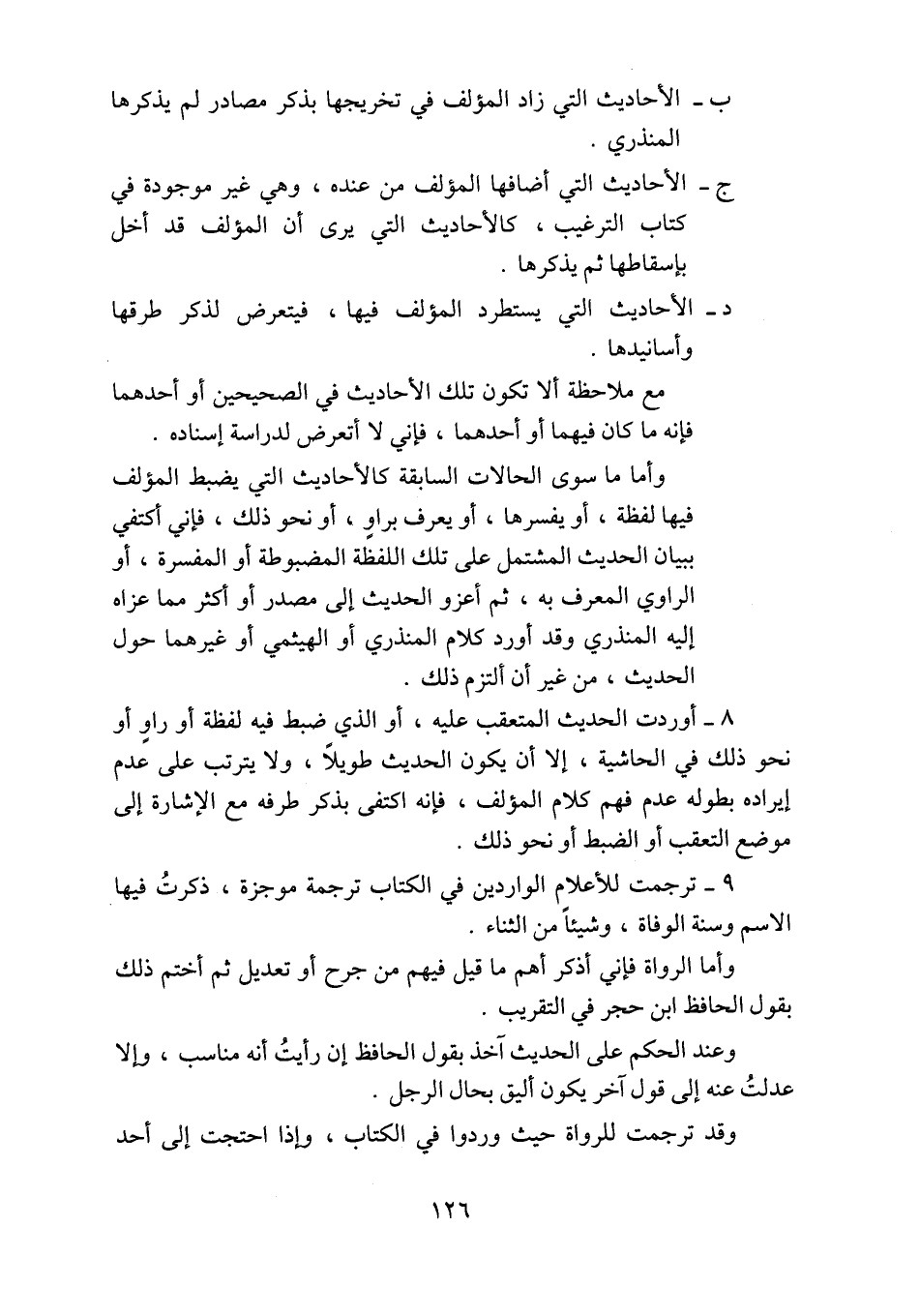 ٨ - أوردت الحديث المتعقب عليه، أو الذي ضبط فيه لفظة أو راوٍ أو نحو ذلك في الحاشية، إلا أن يكون الحديث طويلاً، ولا يترتب على عدم إيراده بطوله عدم فهم كلام المؤلف، فإنه اكتفى بذكر طرفه مع الإشارة إلى موضع التعقب أو الضبط أو نحو ذلك.