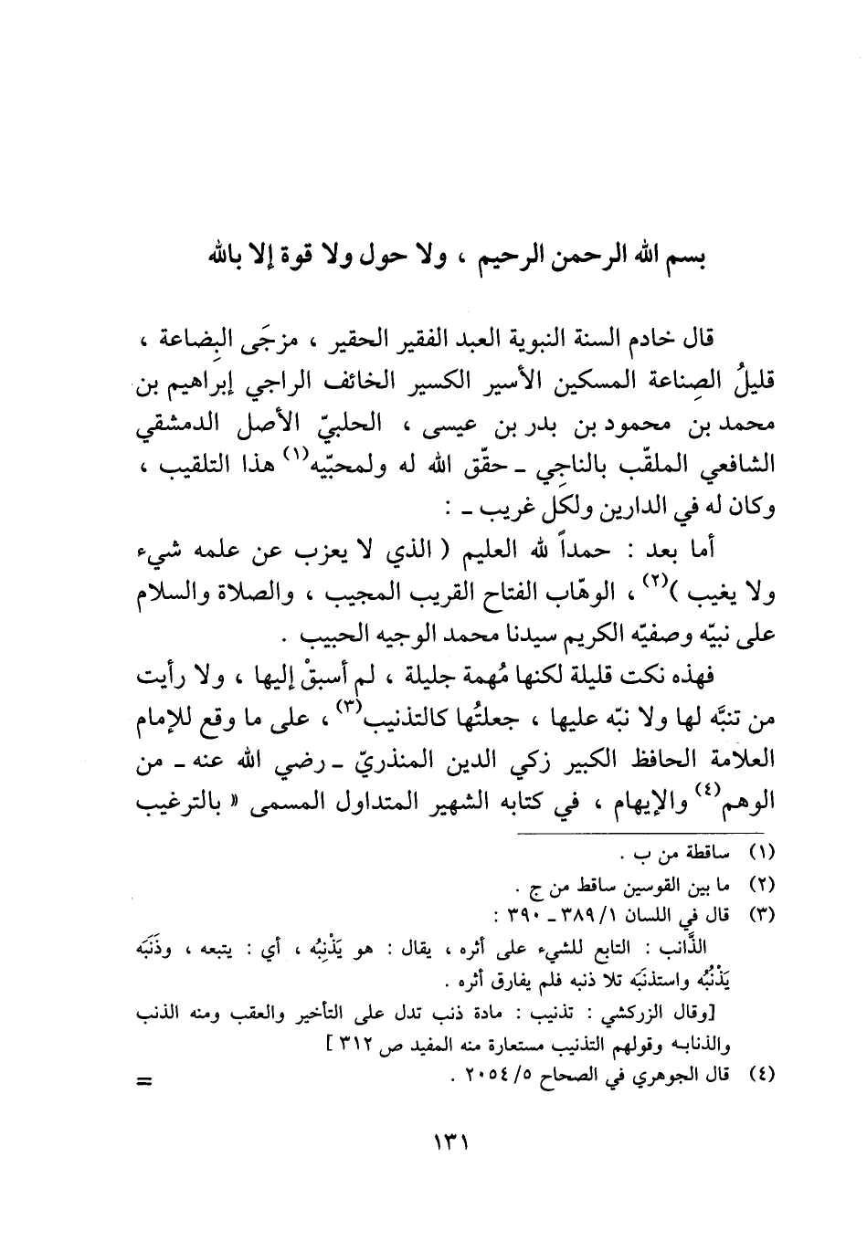 قال خادم السنة النبوية العبد الفقير الحقير، مزجَى البِضاعة، قليلُ الصِناعة المسكين الأسير الكسير الخائف الراجي إبراهيم بن محمد بن محمود بن بدر بن عيسى، الحلبيّ الأصل الدمشقي الشافعي الملقّب بالناجي -حقّق الله له ولمحبّيه هذا التلقيب، وكان له في الدارين ولكل غريب-: