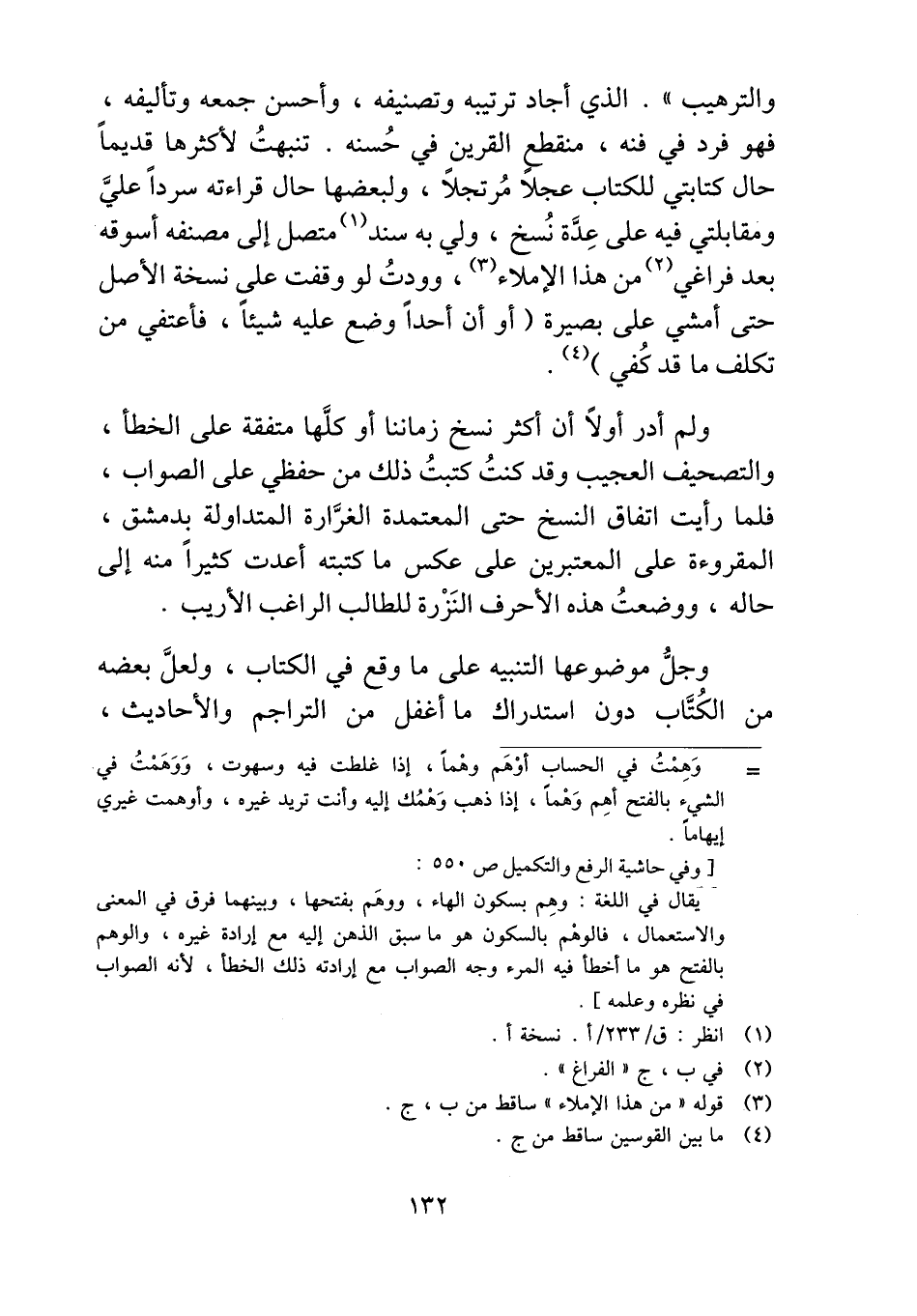 والترهيب". الذي أجاد ترتيبه وتصنيفه، وأحسن جمعه وتأليفه، فهو فرد في فنه، منقطع القرين في حُسنه. تنبهتُ لأكثرها قديماً حال كتابتي للكتاب عجلاً مُرتجلاً، ولبعضها حال قراءته سرداً عليَّ ومقابلتي فيه على عِدَّة نُسخ، ولي به سند متصل إلى مصنفه أسوقه بعد فراغي من هذا الإملاء، وودتُ لو وقفت على نسخة الأصل حتى أمشي على بصيرة (أو أن أحداً وضع عليه شيئاً، فأعتفي من تكلف ما قد كُفي).