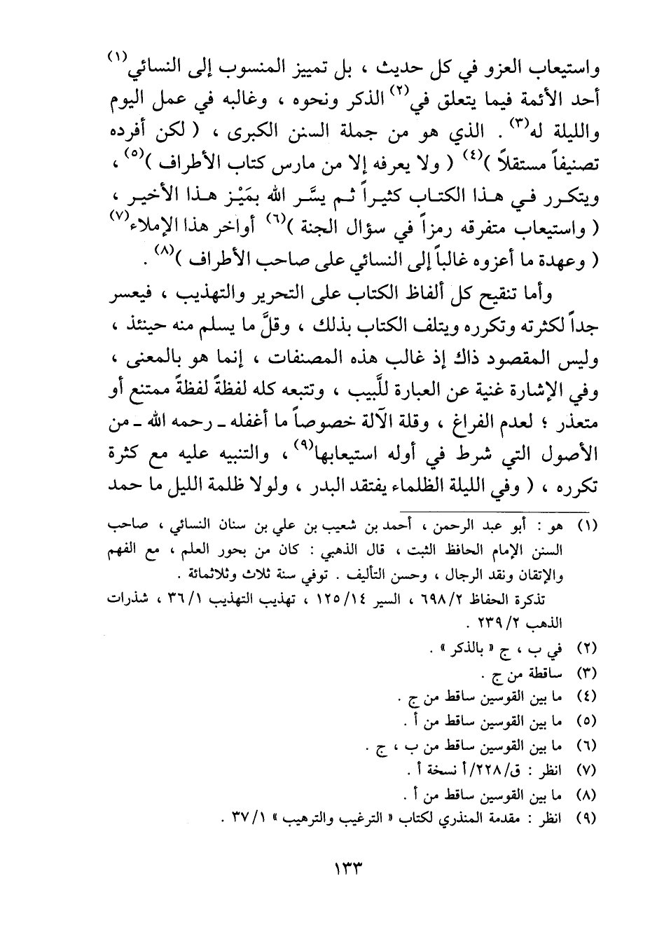 واستيعاب العزو في كل حديث، بل تمييز المنسوب إلى النسائي أحد الأئمة فيما يتعلق في الذكر ونحوه، وغالبه في عمل اليوم والليلة له. الذي هو من جملة السنن الكبرى، (لكن أفرده تصنيفاً مستقلاً) (ولا يعرفه إلا من مارس كتاب الأطراف)، ويتكرر في هذا الكتاب كثيراً ثم يسَّر الله بمَيْز هذا الأخير، (واستيعاب متفرقه رمزاً في سؤال الجنة) أواخر هذا الإملاء (وعهدة ما أعزوه غالباً إلى النسائي على صاحب الأطراف).
