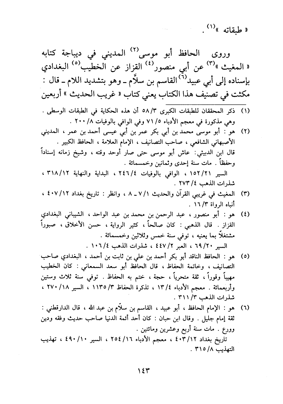وروى الحافظ أبو موسى المديني في ديباجة كتابه "المغيث" عن أبي منصور القزاز عن الخطيب البغدادي بإسناده إلى أبي عبيد القاسم بن سلاَّم -وهو بتشديد اللام- قال: مكثت في تصنيف هذا الكتاب يعني كتاب "غريب الحديث" أربعين