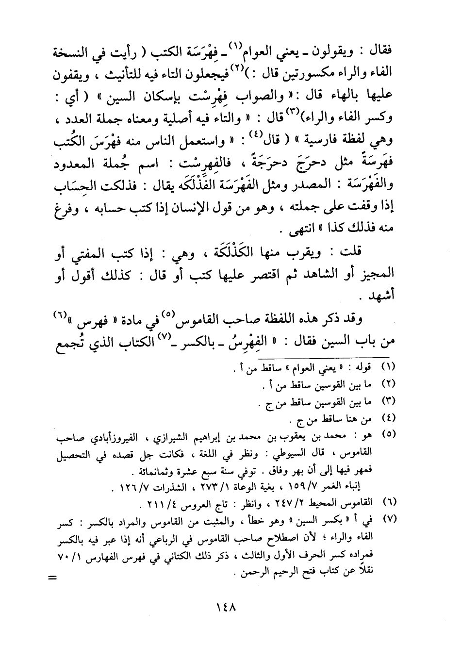 فقال: ويقولون -يعني العوام- فِهْرَسَة الكتب (رأيت في النسخة الفاء والراء مكسورتين قال:) فيجعلون التاء فيه للتأنيث، ويقفون عليها بالهاء قال: "والصواب فِهْرِسْت بإسكان السين" (أي: وكسر الفاء والراء) قال: "والتاء فيه أصلية ومعناه جملة العدد، وهي لفظة فارسية" (قال: "واستعمل الناس منه فهْرَسَ الكُتب فهَرسَةً مثل دحرَجَ دحرَجَةً، فالفِهرِسْت: اسم جُملة المعدود والفَهْرَسَة: المصدر ومثل الفَهْرَسَة الفَذْلَكَه يقال: فذلكت الحِسَاب إذا وقفت على جملته، وهو من قول الإنسان إذا كتب حسابه، وفرغ منه فذلك كذا" انتهى.