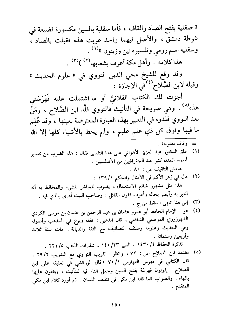 أجزت لك الكتاب الفلانيَّ أو ما اشتملت عليه فَهْرَسَتي هذه. وهي صريحة في التأنيث فالنووي قلَّد ابن الصَّلاح، ومَنْ بعد النووي قلدوه في التعبير بهذه العبارة المعترضة بعينها، وقد عُلِم ما فيها وفوق كل ذي علم عليم، ولم يحط بالأشياء كلها إلا الله