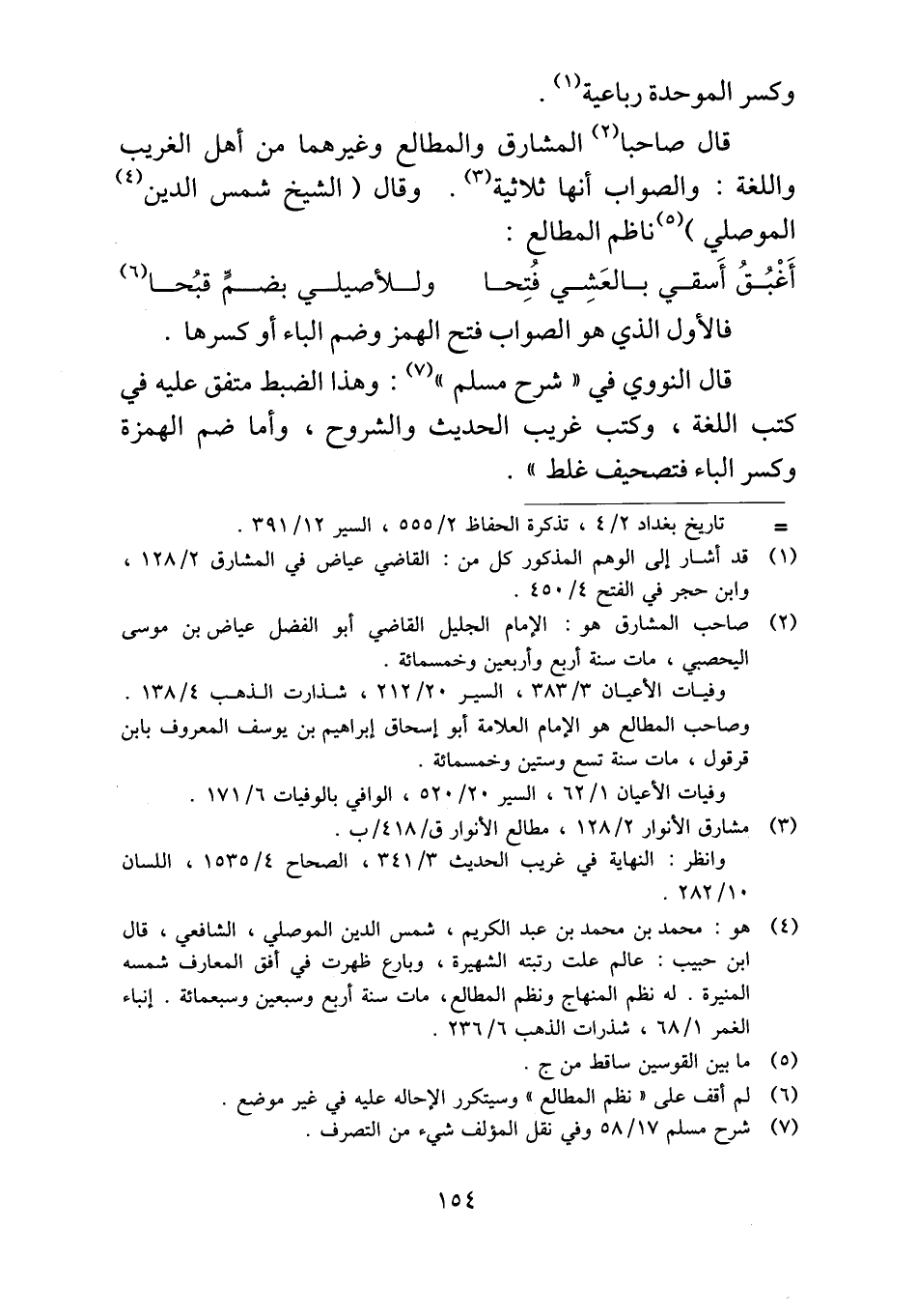 قال صاحبا المشارق والمطالع وغيرهما من أهل الغريب واللغة: والصواب أنها ثلاثية. وقال (الشيخ شمس الدين الموصلي) ناظم المطالع: