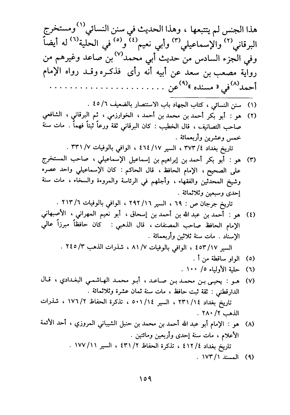 هذا الجنس لم يتتبعها، وهذا الحديث في سنن النسائي ومستخرج البرقاني والإسماعيلي وأبي نعيم في الحلية له أيضاً وفي الجزء السادس من حديث أبي محمد بن صاعد وغيرهم من رواية مصعب بن سعد عن أبيه أنه رأى فذكره وقد رواه الإمام أحمد في "مسنده" عن
