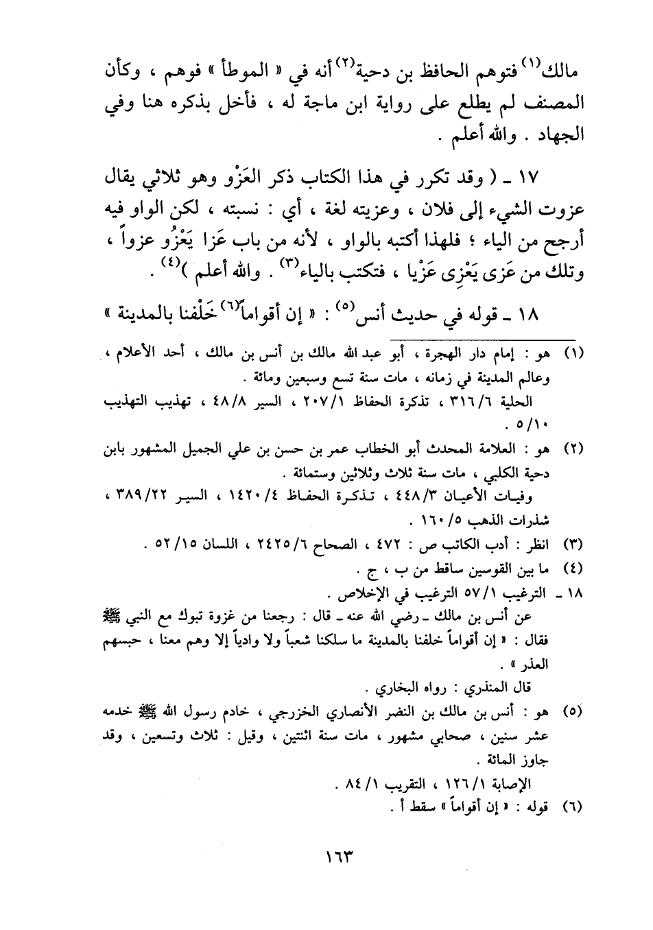 ١٧ - (وقد تكرر في هذا الكتاب ذكر العَزْو وهو ثلاثي يقال عزوت الشيء إلى فلان، وعزيته لغة، أي: نسبته، لكن الواو فيه أرجح من الياء؛ فلهذا أكتبه بالواو، لأنه من باب عَزا يَعْزُو عزواً، وتلك من عَزى يَعْزِى عَزْيا، فتكتب بالياء. والله أعلم).