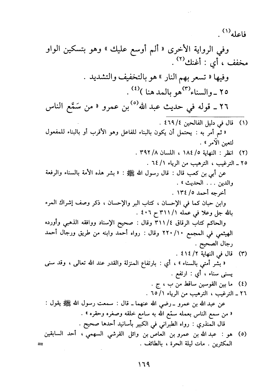 ٢٦ - قوله في حديث عبد الله بن عمرو "من سَمَّع الناس
