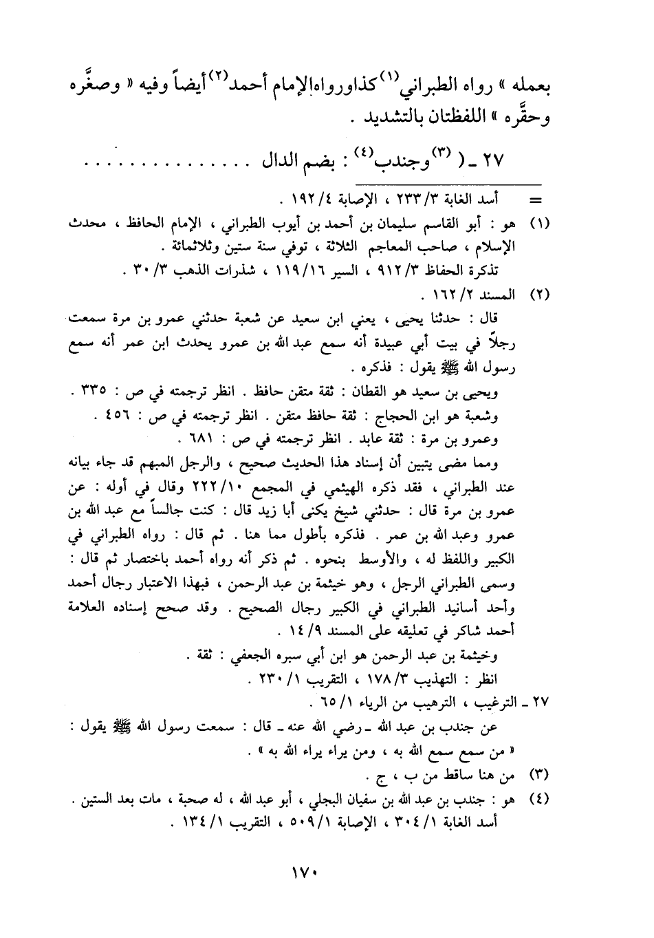 بعمله" رواه الطبراني كذا ورواه الإمام أحمد أيضاً وفيه "وصغَّره وحقَّره" اللفظتان بالتشديد.