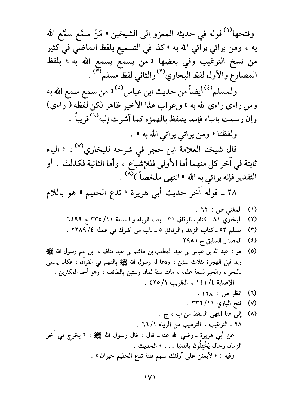 ولمسلم أيضاً من حديث ابن عباس "من سمع سمع الله به ومن راءى راءى الله به" وإعراب هذا الأخير ظاهر لكن لفظه (راءى) وإن رسمت بالياء فإنما يتلفظ بالهمزة كما أشرت إليه قريباً.