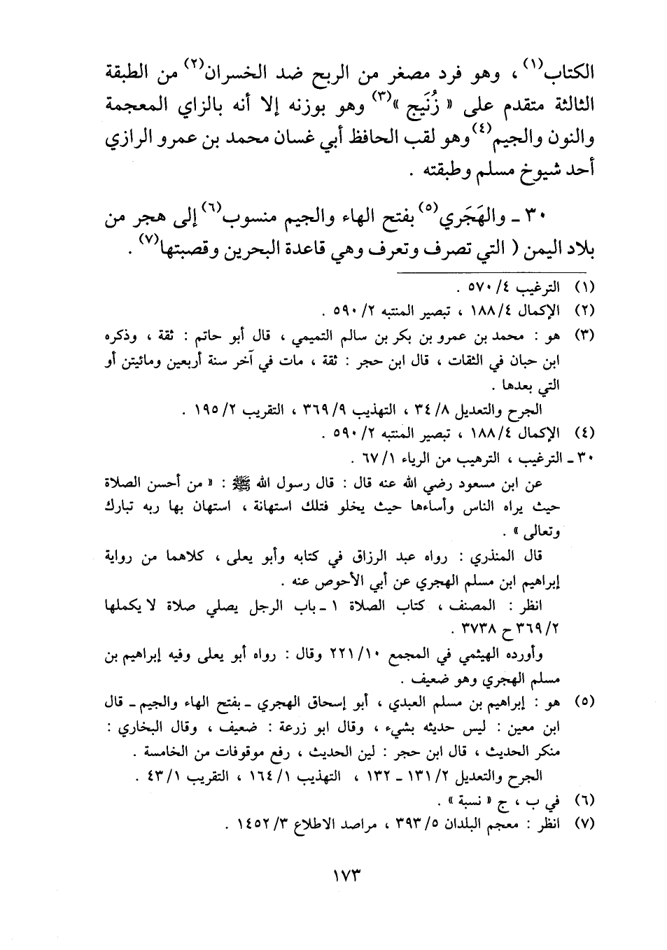 الكتاب، وهو فرد مصغر من الربح ضد الخسران من الطبقة الثالثة متقدم على "زُنَيج" وهو بوزنه إلا أنه بالزاي المعجمة والنون والجيم وهو لقب الحافظ أبي غسان محمد بن عمرو الرازي أحد شيوخ مسلم وطبقته.