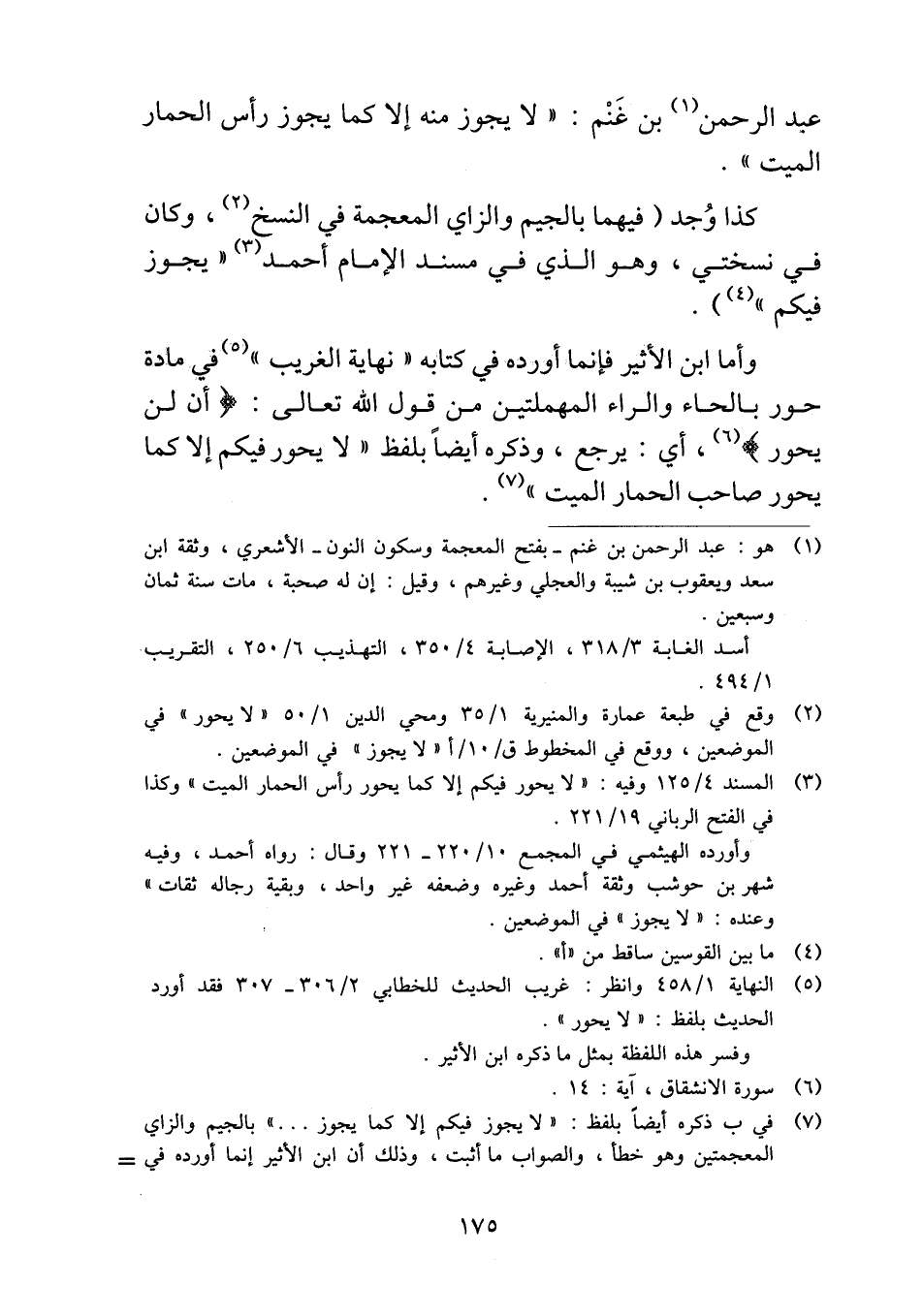 وأما ابن الأثير فإنما أورده في كتابه "نهاية الغريب" في مادة حور بالحاء والراء المهملتين من قول الله تعالى: {أَنْ لَنْ يَحُورَ}، أي: يرجع، وذكره أيضاً بلفظ "لا يحور فيكم إلا كما يحور صاحب الحمار الميت".