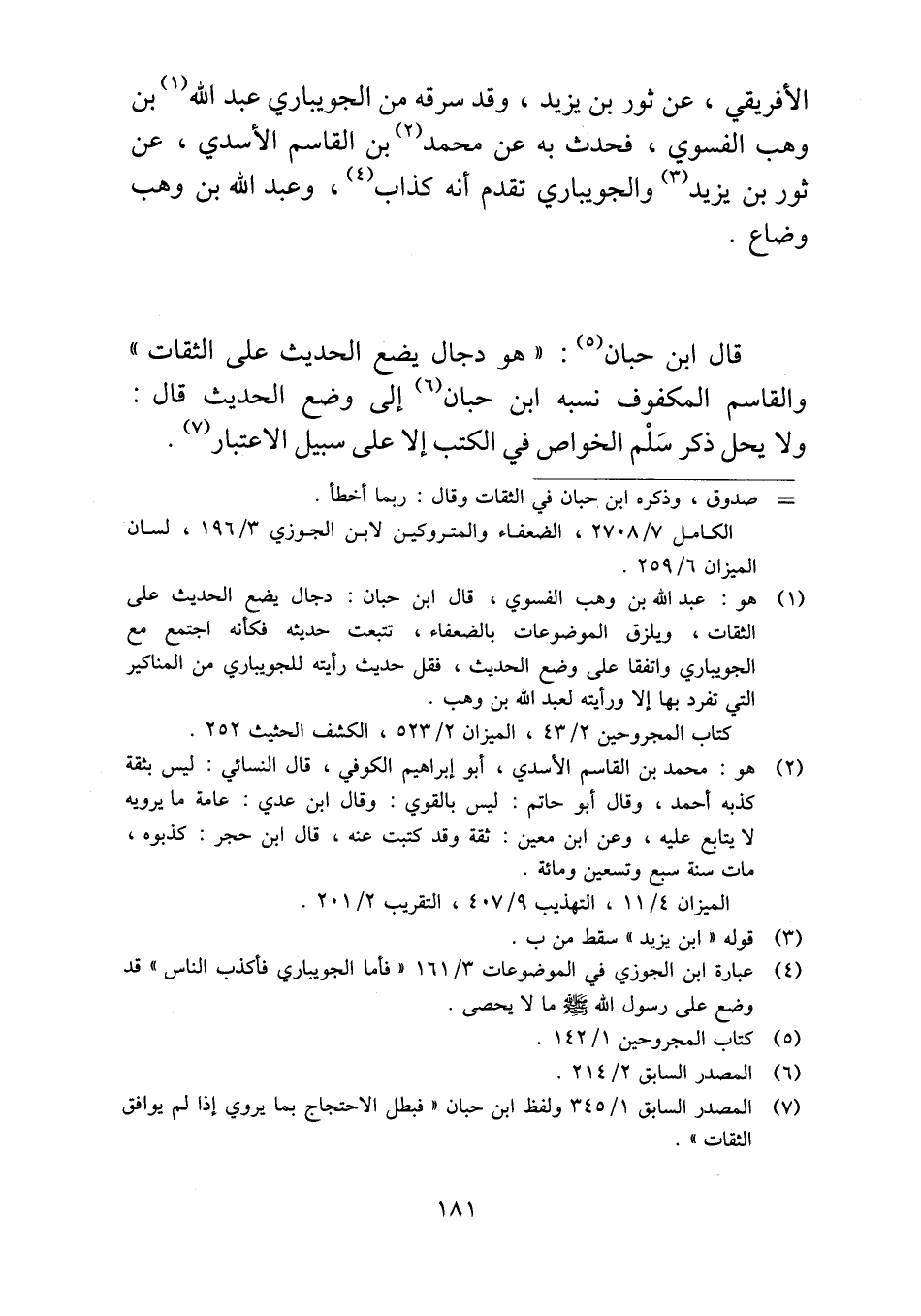الأفريقي، عن ثور بن يزيد، وقد سرقه من الجويباري عبد الله بن وهب الفسوي، فحدث به عن محمد بن القاسم الأسدي، عن ثور بن يزيد والجويباري تقدم أنه كذاب، وعبد الله بن وهب وضاع.