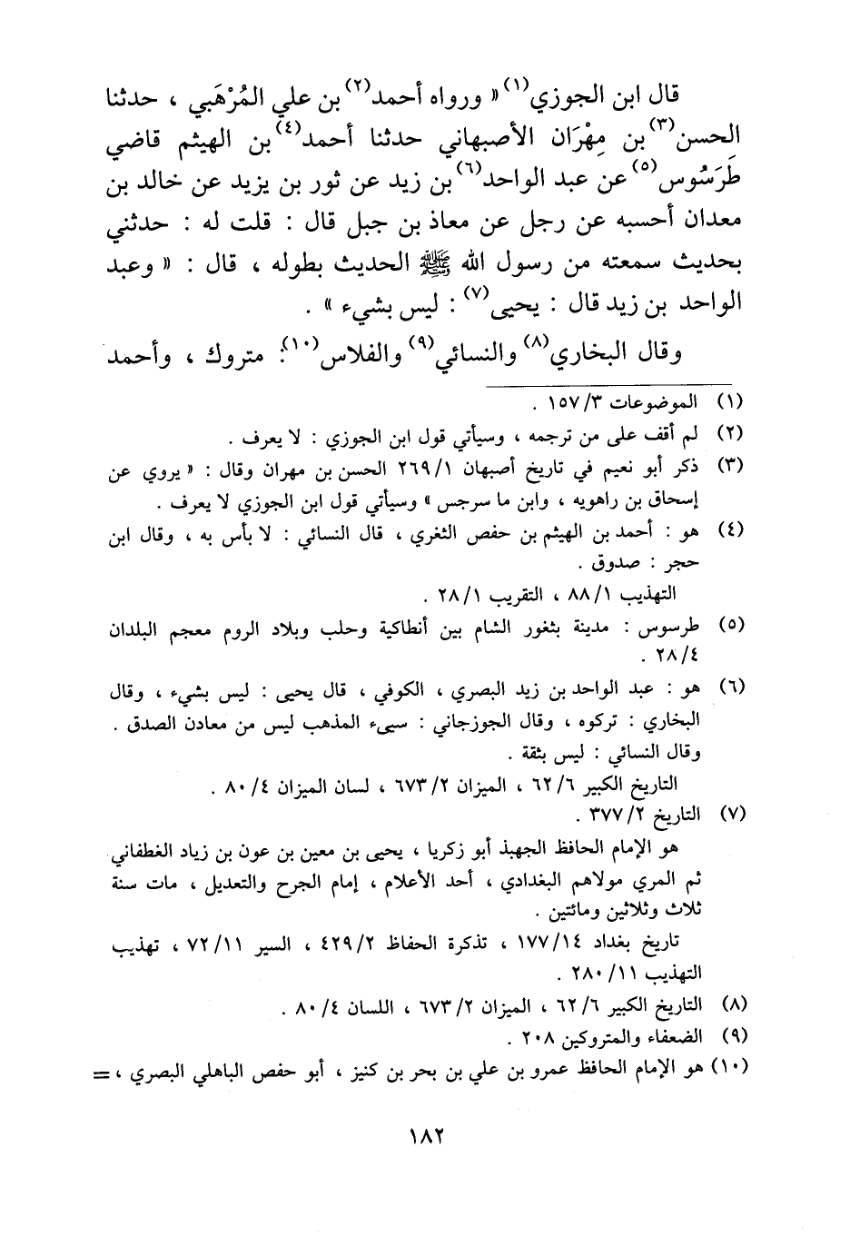 قال ابن الجوزي "ورواه أحمد بن علي المُرْهَبي، حدثنا الحسن بن مِهْرَان الأصبهاني حدثنا أحمد بن الهيثم قاضي طَرَسُوس عن عبد الواحد بن زيد عن ثور بن يزيد عن خالد بن معدان أحسبه عن رجل عن معاذ بن جبل قال: قلت له: حدثني بحديث سمعته من رسول الله - صلى الله عليه وسلم - الحديث بطوله، قال: "وعبد الواحد بن زيد قال: يحيى: ليس بشيء".