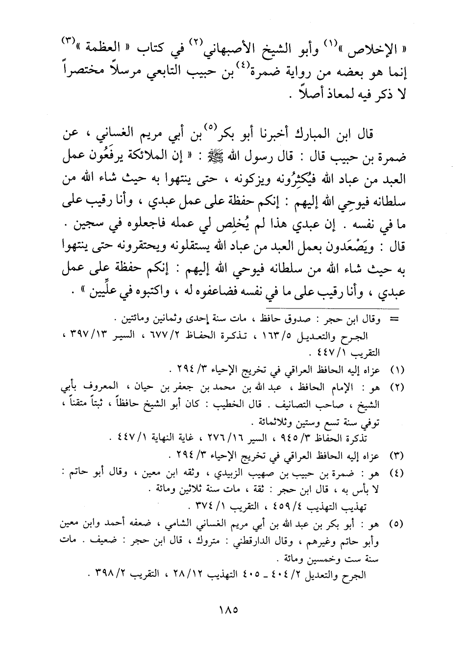 "الإخلاص" وأبو الشيخ الأصبهاني في كتاب "العظمة" إنما هو بعضه من رواية ضمرة بن حبيب التابعي مرسلاً مختصراً لا ذكر فيه لمعاذ أصلاً.