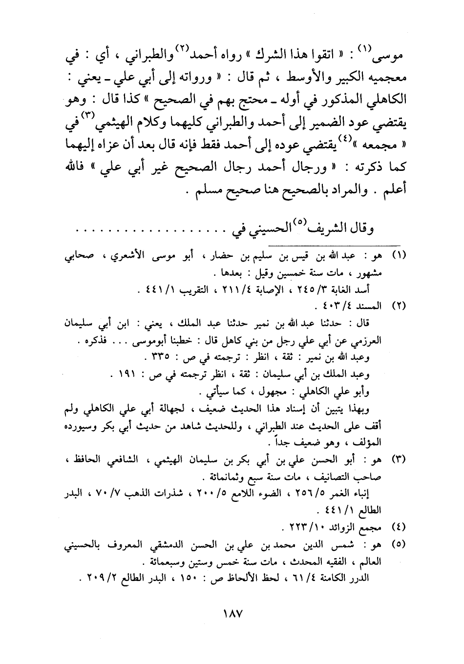 موسى: "اتقوا هذا الشرك" رواه أحمد والطبراني، أي: في معجميه الكبير والأوسط، ثم قال: "ورواته إلى أبي علي -يعني: الكاهلي المذكور في أوله- محتج بهم في الصحيح" كذا قال: وهو يقتضي عود الضمير إلى أحمد والطبراني كليهما وكلام الهيثمي في "مجمعه" يقتضي عوده إلى أحمد فقط فإنه قال بعد أن عزاه إليهما كما ذكرته: "ورجال أحمد رجال الصحيح غير أبي علي" فالله أعلم. والمراد بالصحيح هنا صحيح مسلم.