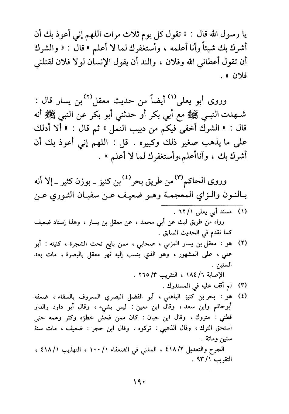 وروى أبو يعلى أيضاً من حديث معقل بن يسار قال: شهدت النبي - صلى الله عليه وسلم - مع أبي بكر أو حدثني أبو بكر عن النبي - صلى الله عليه وسلم - أنه قال: "الشرك أخفى فيكم من دبيب النمل" ثم قال: "ألا أدلك على ما يذهب صغير ذلك وكبيره. قل: اللهم إني أعوذ بك أن أشرك بك، وأنا أعلم، وأستغفرك لما لا أعلم".