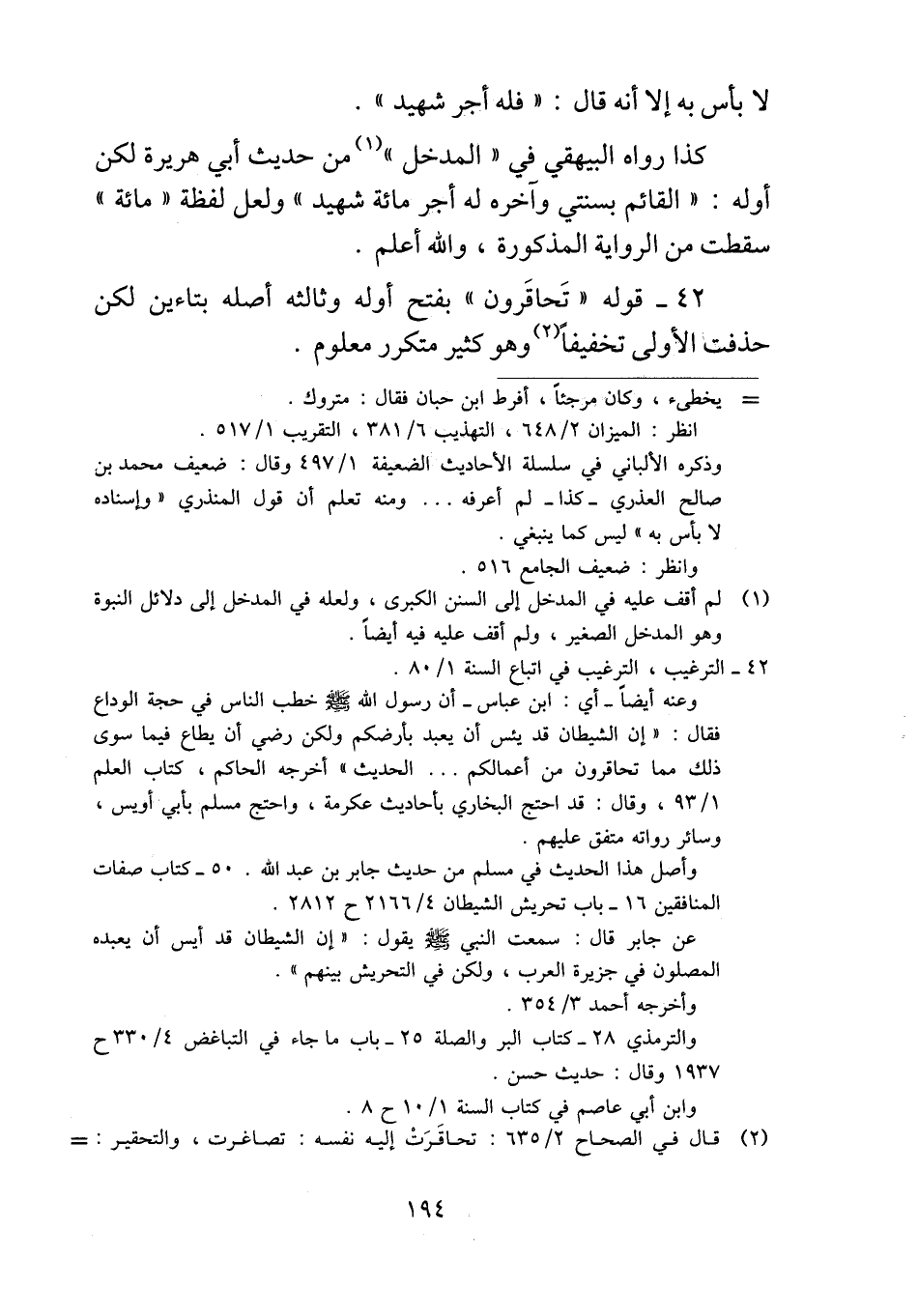 ٤٢ - قوله "تَحاقَرون" بفتح أوله وثالثه أصله بتاءين لكن حذفت الأولى تخفيفاً وهو كثير متكرر معلوم.