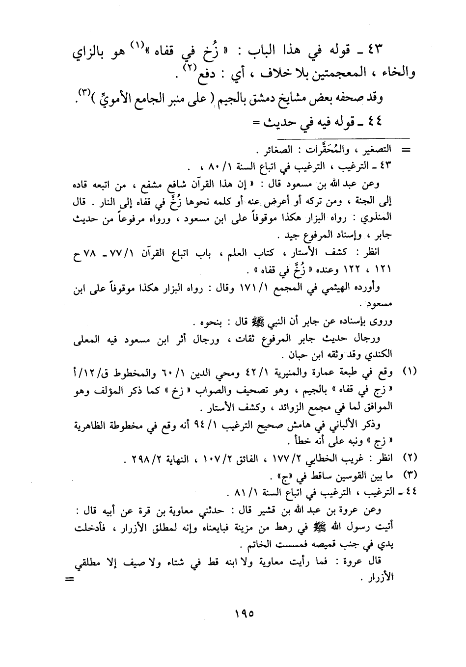 ٤٣ - قوله في هذا الباب: "زُخ في قفاه" هو بالزاي والخاء، المعجمتين بلا خلاف، أي: دفع.