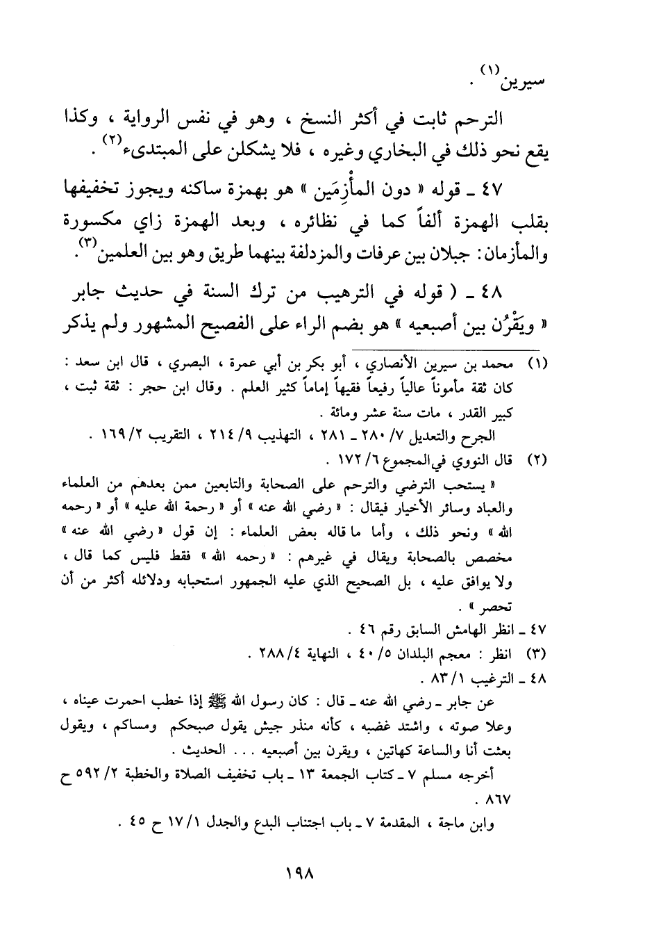 ٤٨ - (قوله في الترهيب من ترك السنة في حديث جابر "ويقرُن بين أصبعيه" هو بضم الراء على الفصيح المشهور ولم يذكر