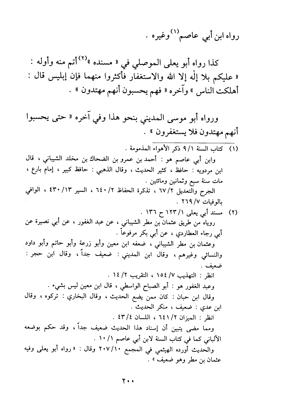 ورواه أبو موسى المديني بنحو هذا وفي آخره "حتى يحسبوا أنهم مهتدون فلا يستغفرون".