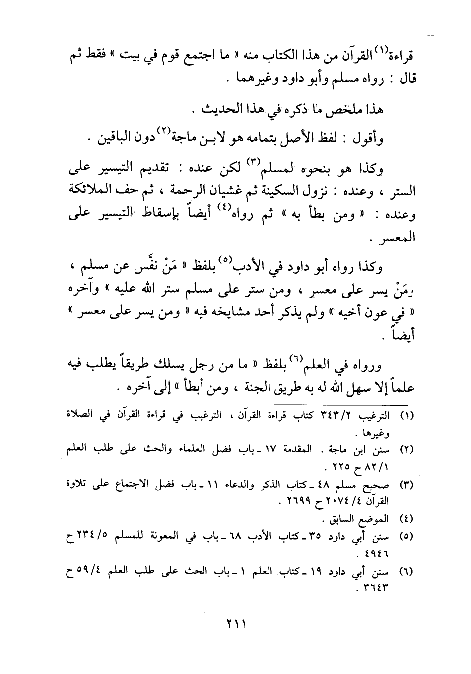 قراءة القرآن من هذا الكتاب منه "ما اجتمع قوم في بيت" فقط ثم قال: رواه مسلم وأبو داود وغيرهما.