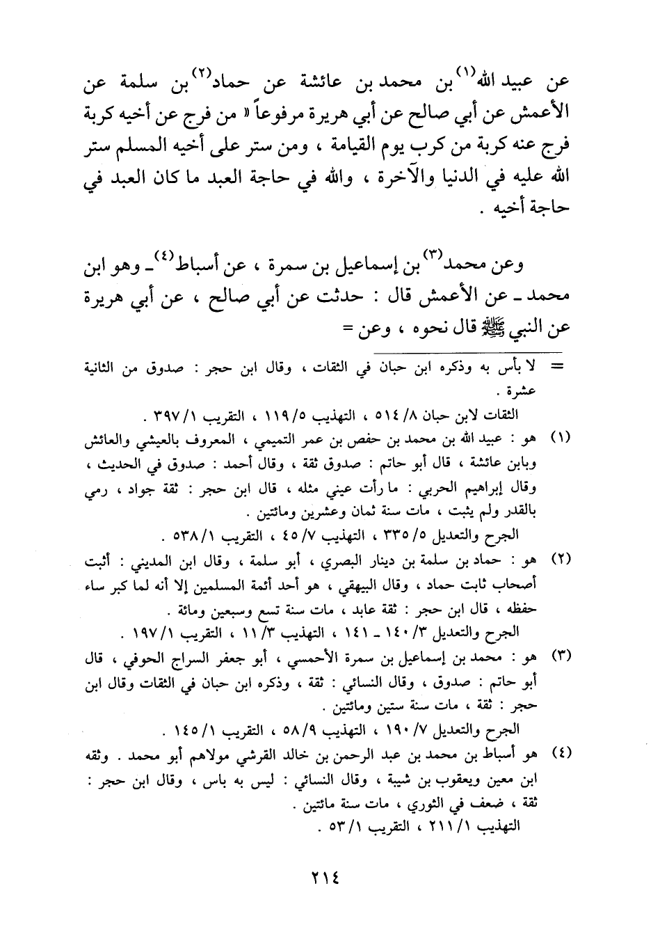 عن عبيد الله بن محمد بن عائشة عن حماد بن سلمة عن الأعمش عن أبي صالح عن أبي هريرة مرفوعاً "من فرج عن أخيه كربة فرج عنه كربة من كرب يوم القيامة، ومن ستر على أخيه المسلم ستر الله عليه في الدنيا والآخرة، والله في حاجة العبد ما كان العبد في حاجة أخيه.