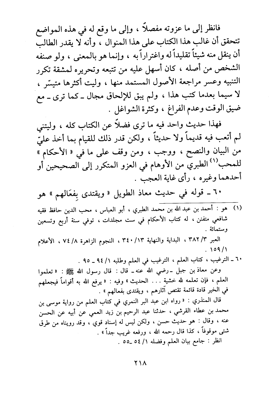 فهذا حديث واحد فيه ما ترى فضلاً عن الكتاب كله، وليتني لم أتعب فيه قديماً ولا حديثاً، ولكن قدر ذلك للقيام بما أخذ عليّ من البيان والنصح، ووجب، ومن وقف على ما في "الأحكام" للمحب الطبري من الأوهام في العزو المتكرر إلى الصحيحين أو أحدهما وغيره، رأى غاية العجب.