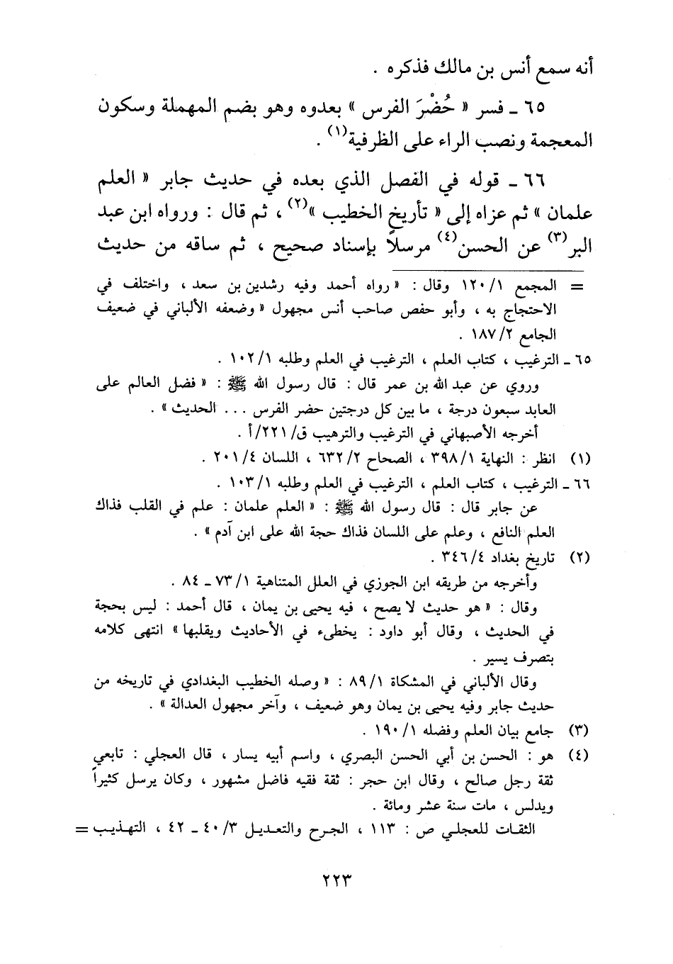 ٦٦ - قوله في الفصل الذي بعده في حديث جابر "العلم علمان" ثم عزاه إلى "تأريخ الخطيب"، ثم قال: ورواه ابن عبد البر عن الحسن مرسلاً بإسناد صحيح، ثم ساقه من حديث