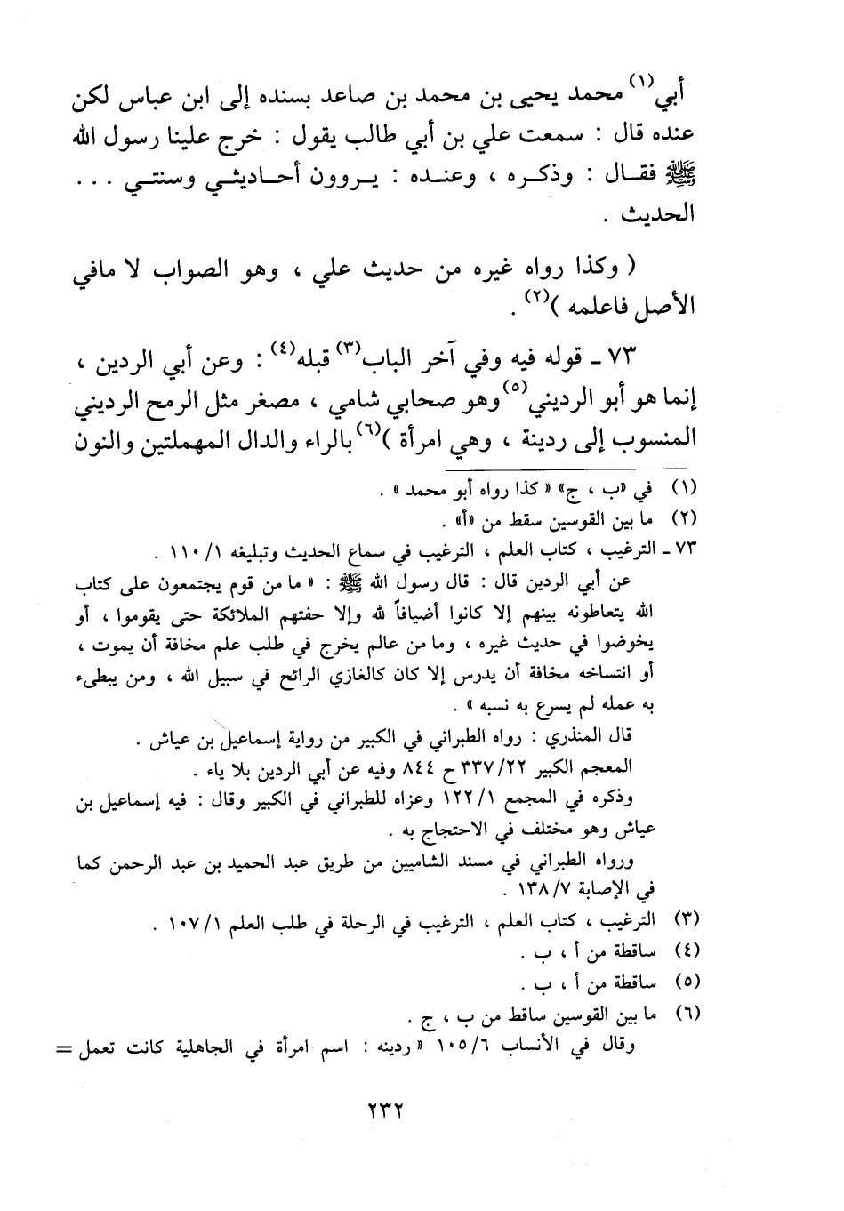 ٧٣ - قوله فيه وفي آخر الباب قبله: وعن أبي الردين، إنما هو أبو الرديني وهو صحابي شامي، مصغر مثل الرمح الرديني المنسوب إلى ردينة، وهي امرأة) بالراء والدال المهملتين والنون