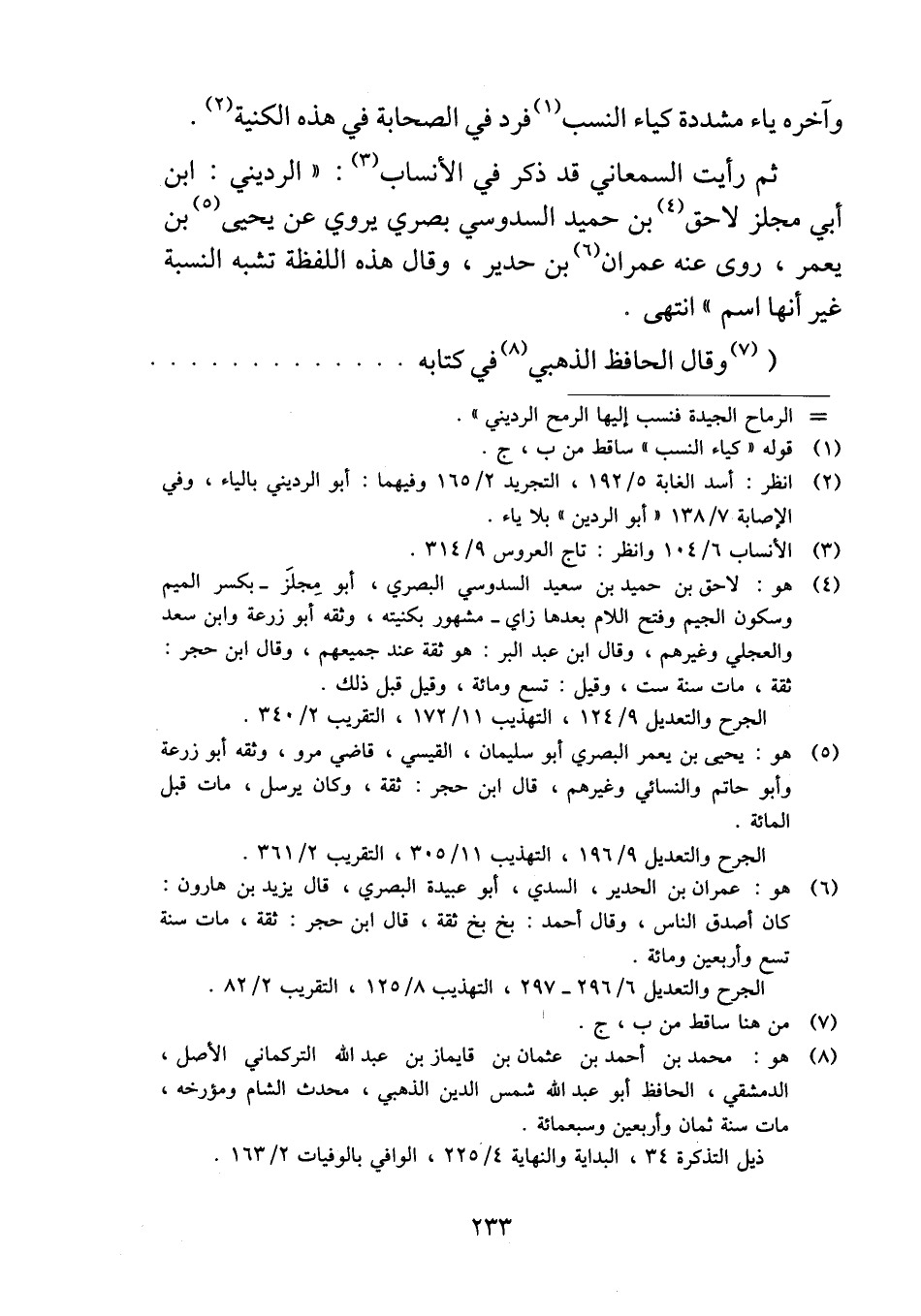 ثم رأيت السمعاني قد ذكر في الأنساب: "الرديني: ابن أبي مجلز لاحق بن حميد السدوسي بصري يروي عن يحيى بن يعمر، روى عنه عمران بن حدير، وقال هذه اللفظة تشبه النسبة غير أنها اسم" انتهى.