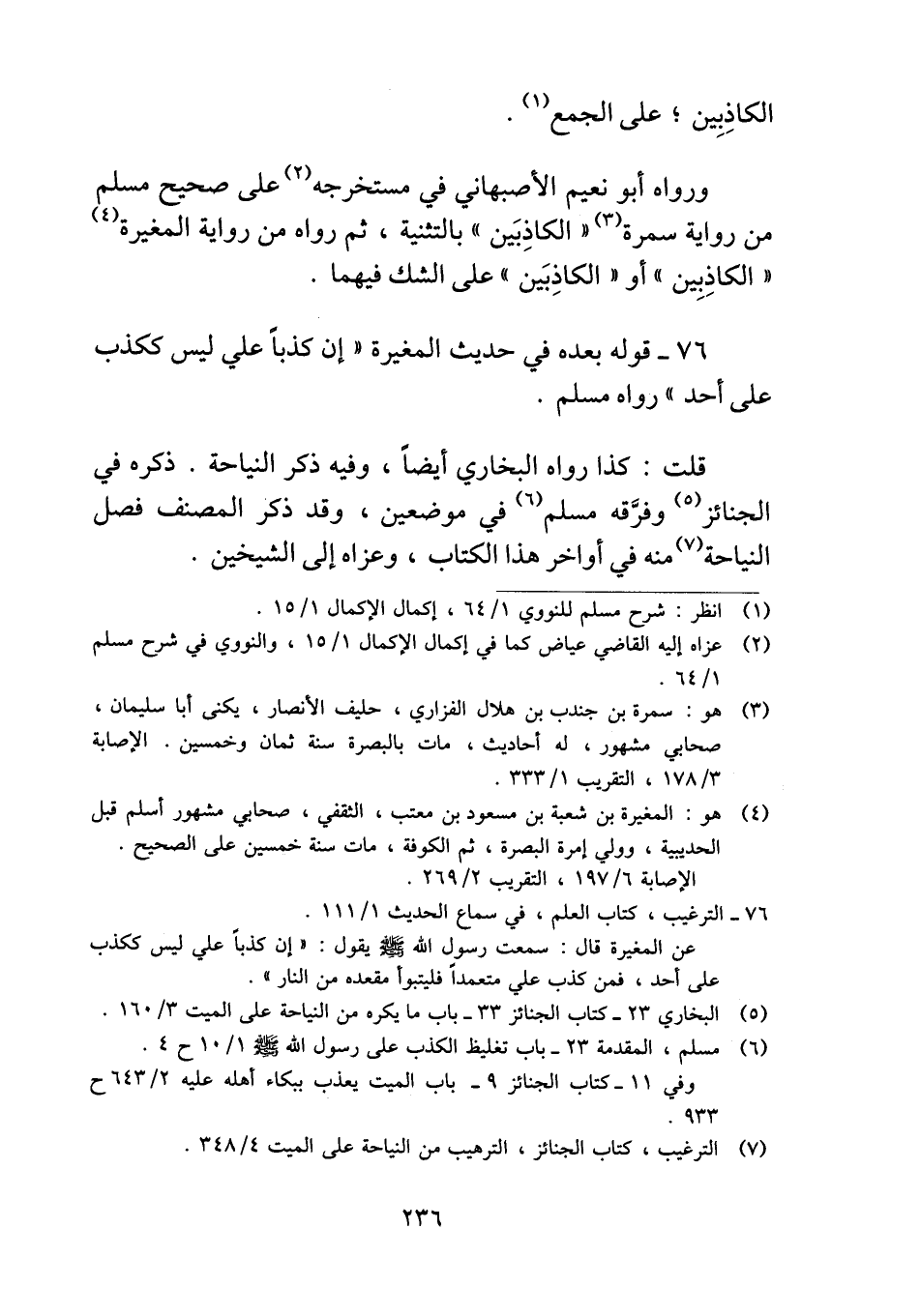 ٧٦ - قوله بعده في حديث المغيرة "إن كذباً علي ليس ككذب على أحد" رواه مسلم.