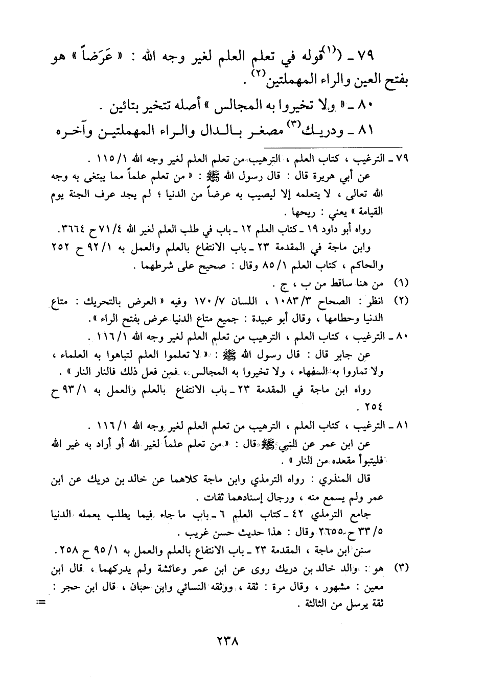٧٩ - (قوله في تعلم العلم لغير وجه الله: "عَرَضاً" هو بفتح العين والراء المهملتين.