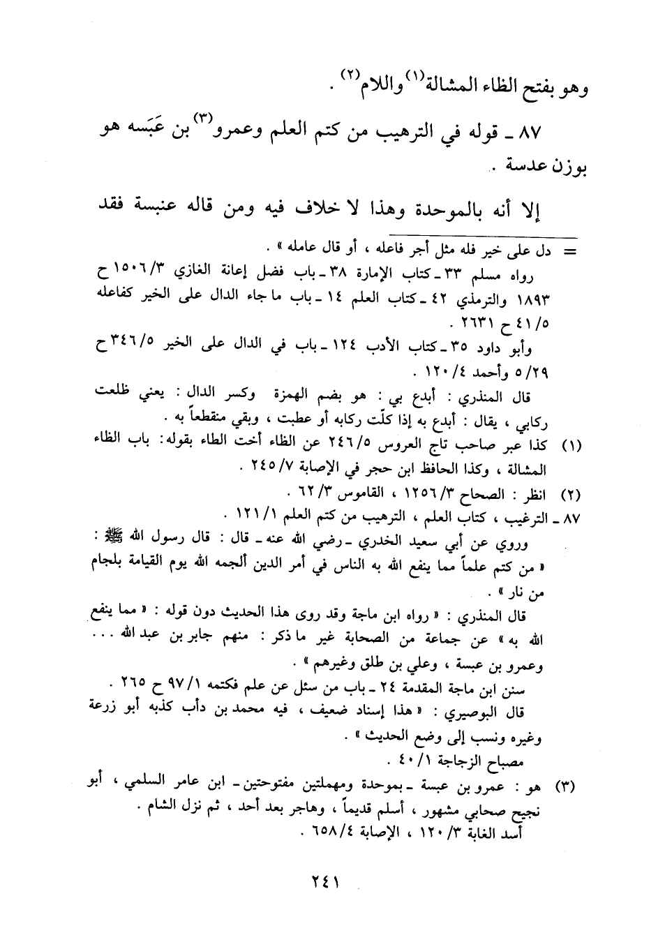٨٧ - قوله في الترهيب من كتم العلم وعمرو بن عَبَسه هو بوزن عدسة.