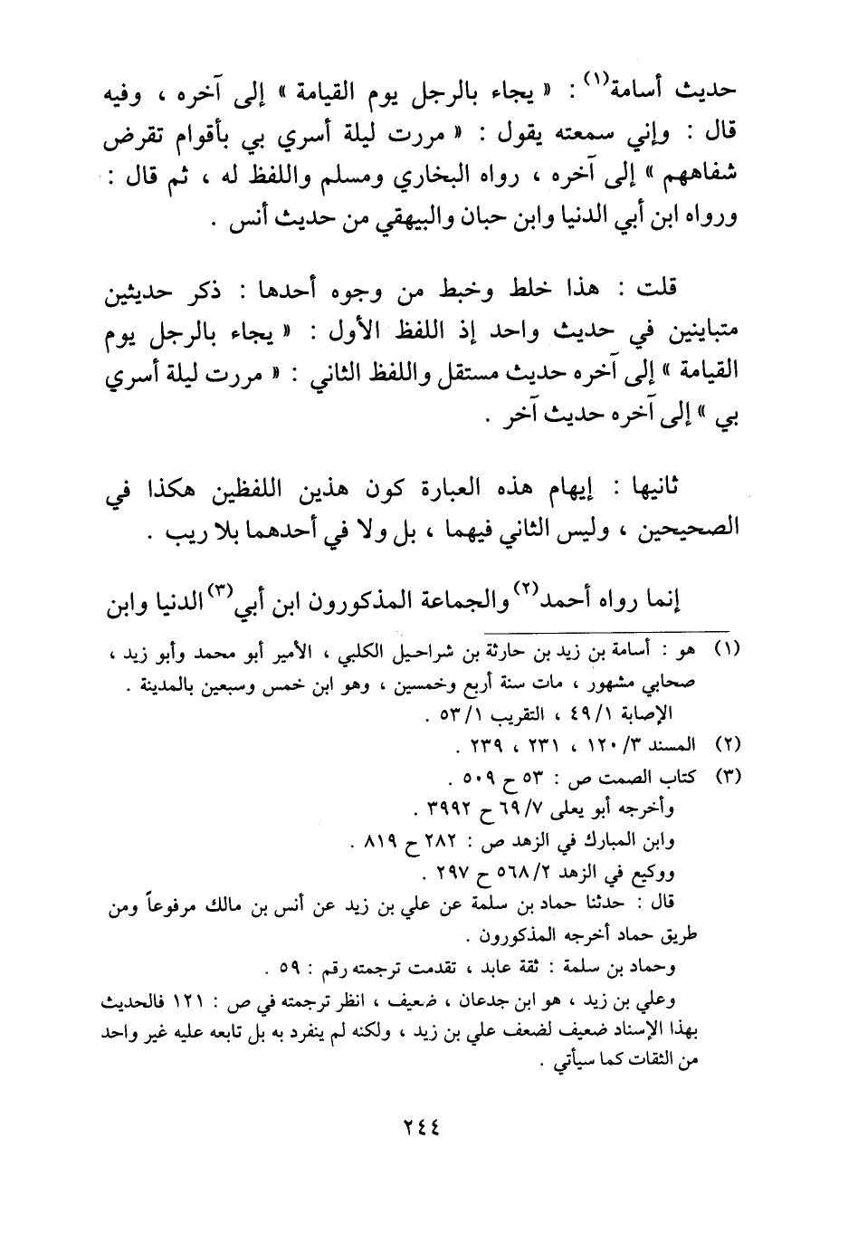 حديث أسامة: "يجاء بالرجل يوم القيامة" إلى آخره، وفيه قال: وإني سمعته يقول: "مررت ليلة أسري بي بأقوام تقرض شفاههم" إلى آخره، رواه البخاري ومسلم واللفظ له، ثم قال: ورواه ابن أبي الدنيا وابن حبان والبيهقي من حديث أنس.