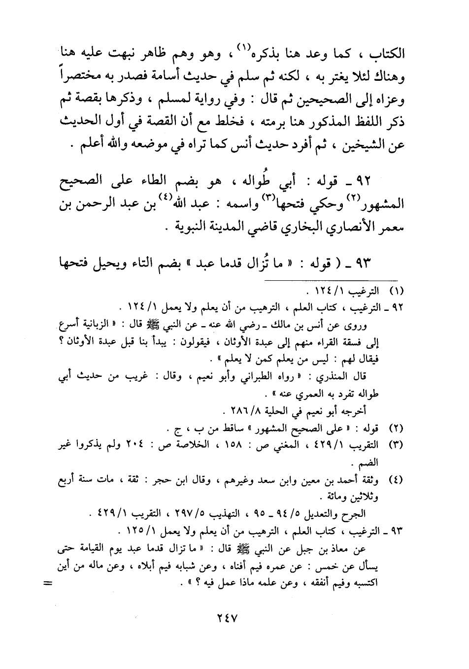 الكتاب، كما وعد هنا بذكره، وهو وهم ظاهر نبهت عليه هنا وهناك لئلا يغتر به، لكنه ثم سلم في حديث أسامة فصدر به مختصراً وعزاه إلى الصحيحين ثم قال: وفي رواية لمسلم، وذكرها بقصة ثم ذكر اللفظ المذكور هنا برمته، فخلط مع أن القصة في أول الحديث عن الشيخين، ثم أفرد حديث أنس كما تراه في موضعه والله أعلم.