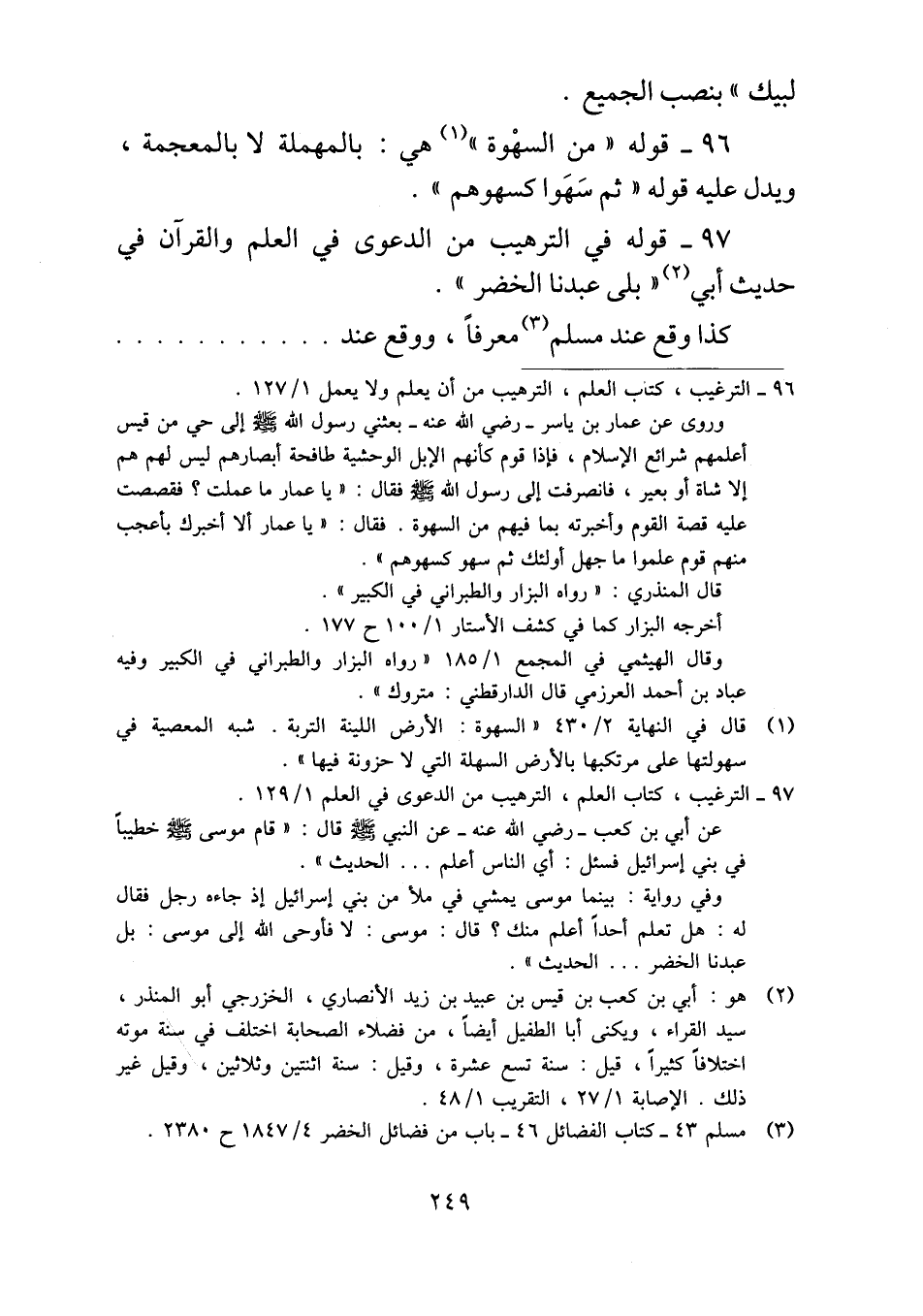٩٧ - قوله في الترهيب من الدعوى في العلم والقرآن في حديث أبي "بلى عبدنا الخضر".