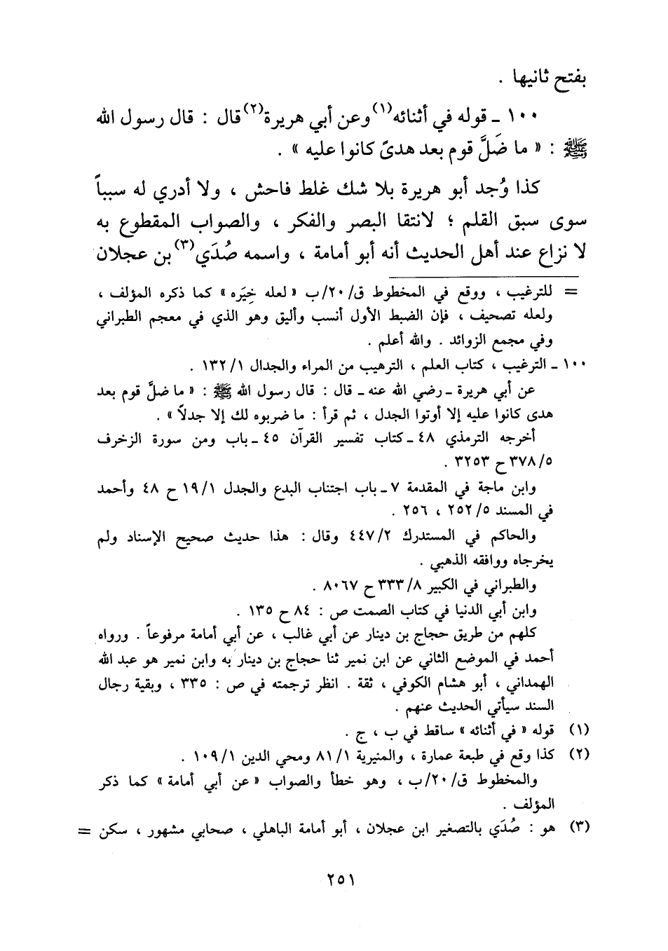 ١٠٠ - قوله في أثنائه وعن أبي هريرة قال: قال رسول الله - صلى الله عليه وسلم -: "ما ضلَّ قوم بعد هدىً كانوا عليه".