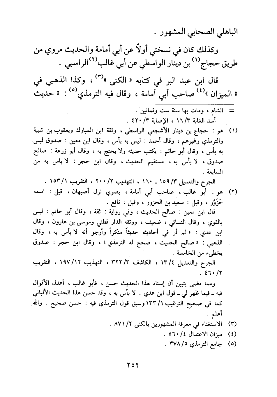 وكذلك كان في نسختي أولاً عن أبي أمامة والحديث مروي من طريق حجاج بن دينار الواسطي عن أبي غالب الراسبي.